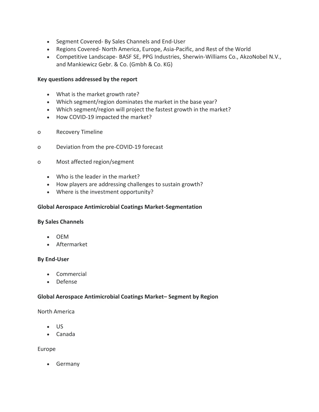 Segment Covered- By Sales Channels and End-User Regions Covered- North America, Europe, Asia-Pacific, and Rest of the World Competitive Landscape- BASF SE, PPG Industries, Sherwin-Williams Co., AkzoNobel N.V., and Mankiewicz Gebr. & Co. (Gmbh & Co. KG) Key questions addressed by the report What is the market growth rate? Which segment/region dominates the market in the base year? Which segment/region will project the fastest growth in the market? How COVID-19 impacted the market? o Recovery Timeline o Deviation from the pre-COVID-19 forecast o Most affected region/segment Who is the leader in the market? How players are addressing challenges to sustain growth? Where is the investment opportunity? Global Aerospace Antimicrobial Coatings Market-Segmentation By Sales Channels OEM Aftermarket By End-User Commercial Defense Global Aerospace Antimicrobial Coatings Market– Segment by Region North America US Canada Europe Germany