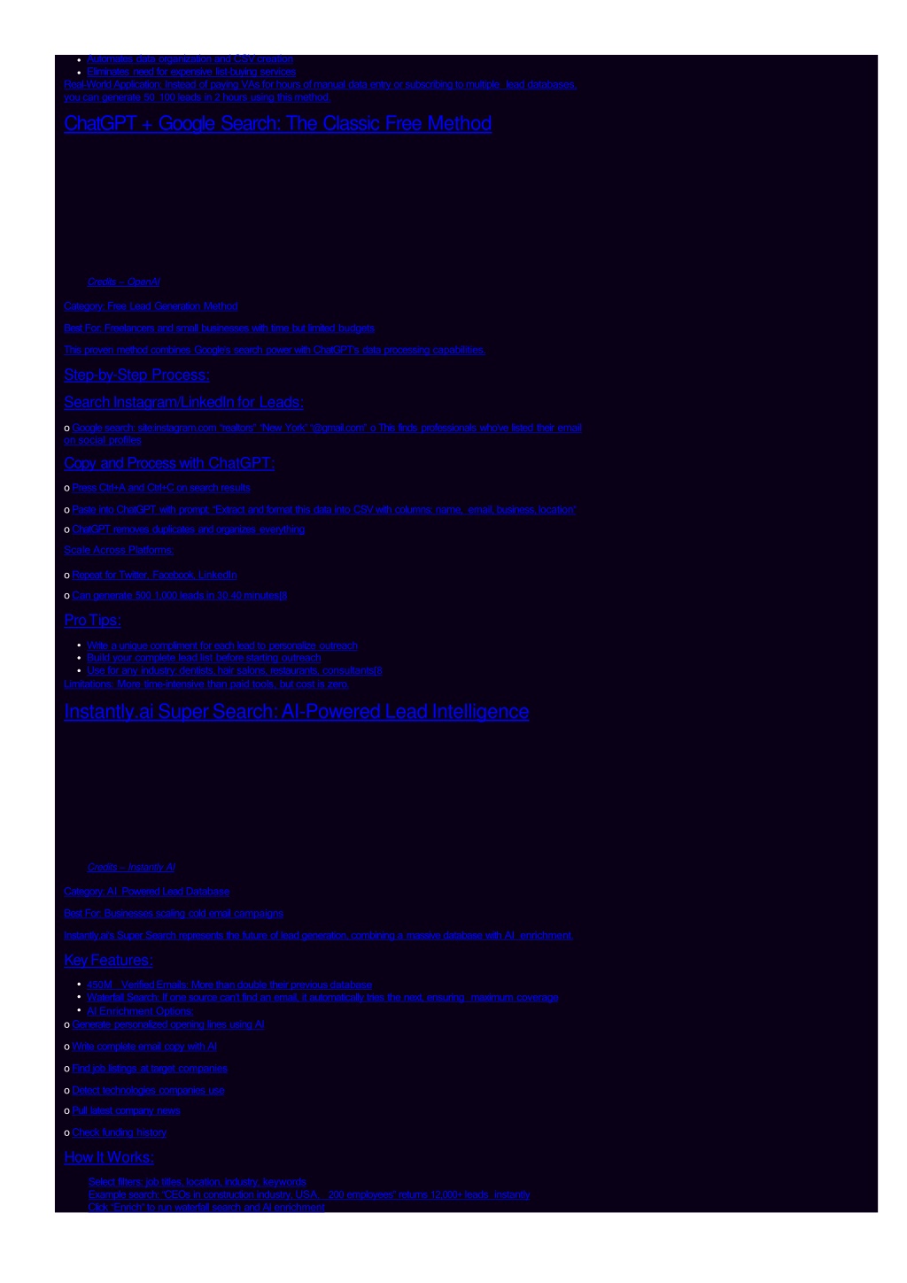 AutomatesdataorganizationandCSVcreationEliminatesneedforexpensivelist-buyingservicesAutomatesdataorganizationandCSVcreationEliminatesneedforexpensivelist-buyingservices Real-WorldApplication:InsteadofpayingVAsforhoursofmanualdataentryor subscribingtomultiplelead databases,youcangenerate50100leadsin2hoursusing thismethod. ChatGPT+ GoogleSearch:TheClassicFreeMethod • Credits – OpenAI • Category:FreeLeadGenerationMethod • BestFor:Freelancersandsmallbusinesseswithtimebutlimitedbudgets • ThisprovenmethodcombinesGoogleʼssearchpowerwithChatGPTʼsdataprocessingcapabilities. • Step-by-StepProcess: • Search Instagram/LinkedInforLeads: • Googlesearch:site:instagram.com“realtors”“NewYork”“@gmail.com”oThisfindsprofessionalswhoʼvelistedtheiremailonsocial profiles • CopyandProcesswithChatGPT: • PressCtrl+AandCtrl+Consearch results • PasteintoChatGPTwithprompt:“ExtractandformatthisdataintoCSVwithcolumns:name,email,business,location” • ChatGPTremovesduplicatesandorganizeseverythingScaleAcrossPlatforms: • RepeatforTwitter,Facebook,LinkedIn • Cangenerate5001,000 leadsin3040minutes[8 • ProTips: • WriteauniquecomplimentforeachleadtopersonalizeoutreachBuildyourcompleteleadlistbeforestartingoutreach • Useforanyindustry:dentists,hairsalons,restaurants,consultants[8Limitations:Moretime-intensivethanpaid tools,butcostiszero. • Instantly.aiSuperSearch:AI-PoweredLeadIntelligence • Credits–InstantlyAI • Category:AIPoweredLeadDatabase • BestFor:Businessesscalingcoldemailcampaigns • Instantly.ai‘sSuperSearchrepresentsthefutureofleadgeneration,combiningamassivedatabasewithAIenrichment. • KeyFeatures: • 450MVerifiedEmails:More thandoubletheirpreviousdatabase • WaterfallSearch:Ifonesourcecanʼtfind anemail,itautomaticallytriesthenext,ensuringmaximumcoverageAIEnrichmentOptions: • GeneratepersonalizedopeninglinesusingAI • WritecompleteemailcopywithAI • Findjoblistingsattargetcompanies • Detecttechnologiescompaniesuse • Pulllatestcompanynews • Checkfundinghistory • HowItWorks: • Selectfilters:jobtitles,location,industry,keywords • Examplesearch:“CEOsinconstructionindustry,USA,200employees”returns12,000+leadsinstantlyClick“Enrich”torunwaterfallsearchandAIenrichment