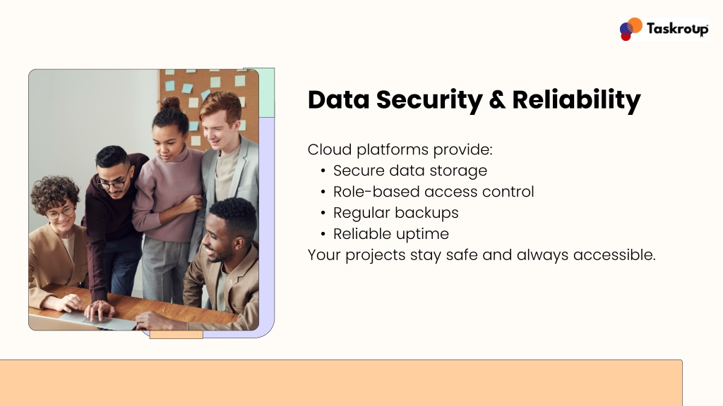 Data Security & Reliability • Cloud platforms provide: • Secure data storage • Role-based access control • Regular backups • Reliable uptime • Your projects stay safe and always accessible.