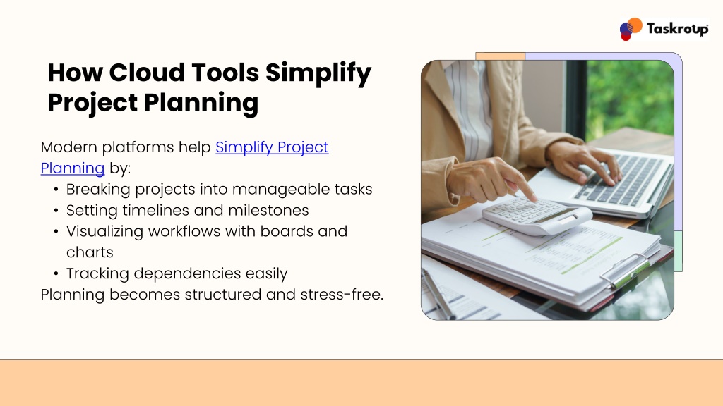How Cloud Tools Simplify Project Planning • Modern platforms help Simplify Project Planning by: • Breaking projects into manageable tasks • Setting timelines and milestones • Visualizing workflows with boards and charts • Tracking dependencies easily • Planning becomes structured and stress-free.