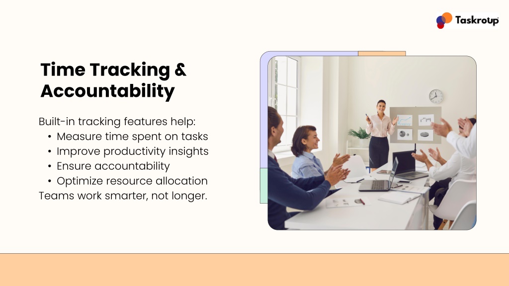 Time Tracking & Accountability • Built-in tracking features help: • Measure time spent on tasks • Improve productivity insights • Ensure accountability • Optimize resource allocation • Teams work smarter, not longer.