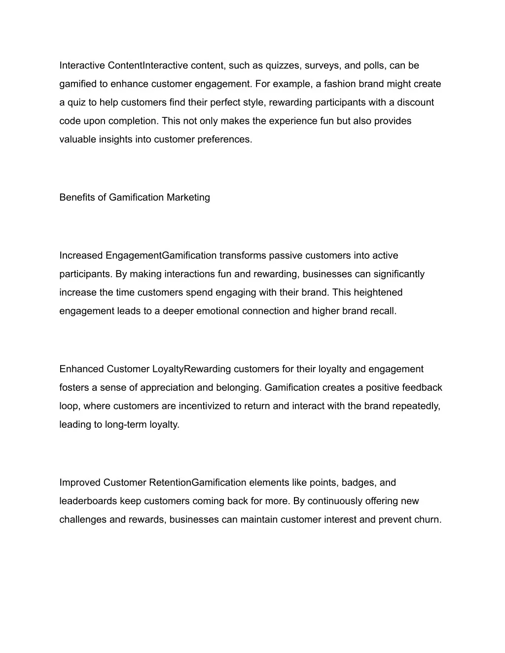 Interactive ContentInteractive content, such as quizzes, surveys, and polls, can be gamified to enhance customer engagement. For example, a fashion brand might create a quiz to help customers find their perfect style, rewarding participants with a discount code upon completion. This not only makes the experience fun but also provides valuable insights into customer preferences. Benefits of Gamification Marketing Increased EngagementGamification transforms passive customers into active participants. By making interactions fun and rewarding, businesses can significantly increase the time customers spend engaging with their brand. This heightened engagement leads to a deeper emotional connection and higher brand recall. Enhanced Customer LoyaltyRewarding customers for their loyalty and engagement fosters a sense of appreciation and belonging. Gamification creates a positive feedback loop, where customers are incentivized to return and interact with the brand repeatedly, leading to long-term loyalty. Improved Customer RetentionGamification elements like points, badges, and leaderboards keep customers coming back for more. By continuously offering new challenges and rewards, businesses can maintain customer interest and prevent churn.
