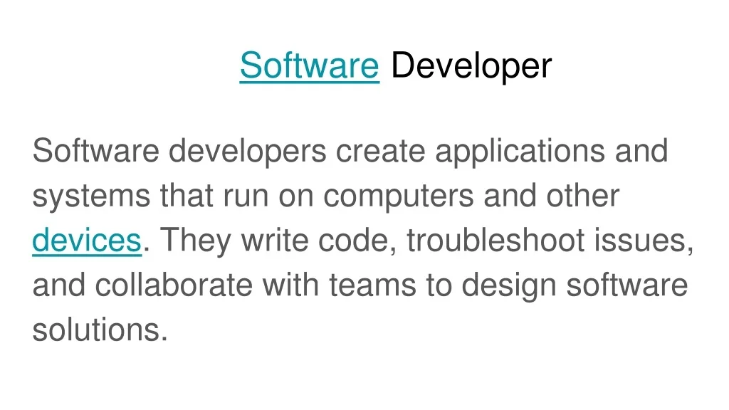 Software Developer Software developers create applications and systems that run on computers and other devices. They write code, troubleshoot issues, and collaborate with teams to design software solutions.