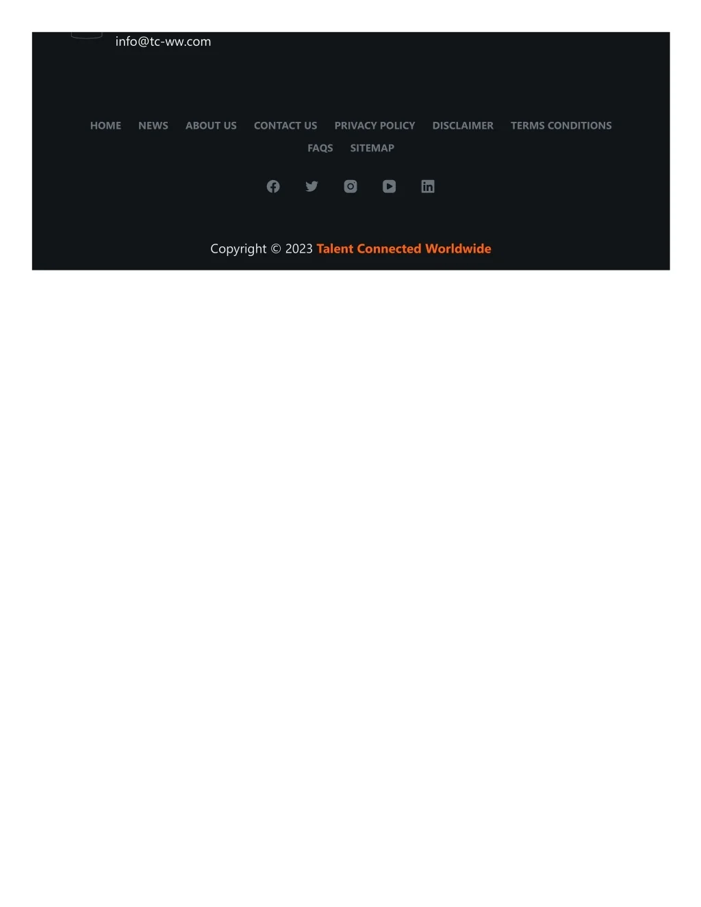 info@tc-ww.com HOME NEWS ABOUT US CONTACT US PRIVACY POLICY DISCLAIMER TERMS CONDITIONS FAQS SITEMAP Copyright © 2023 Talent Connected Worldwide