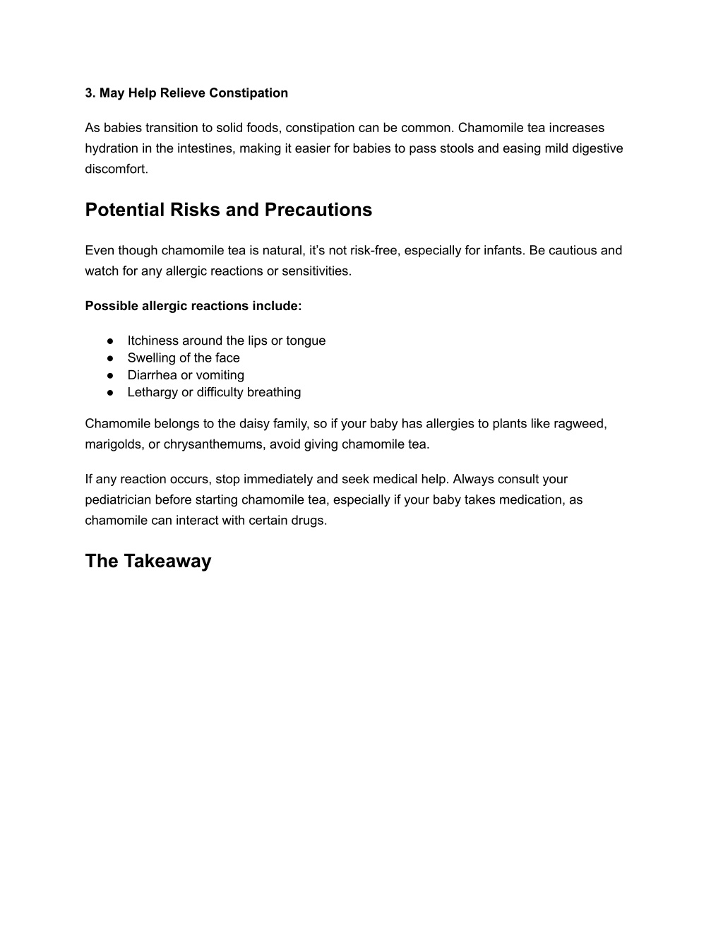3. May Help Relieve Constipation As babies transition to solid foods, constipation can be common. Chamomile tea increases hydration in the intestines, making it easier for babies to pass stools and easing mild digestive discomfort. Potential Risks and Precautions Even though chamomile tea is natural, it’s not risk-free, especially for infants. Be cautious and watch for any allergic reactions or sensitivities. Possible allergic reactions include: ● Itchiness around the lips or tongue ● Swelling of the face ● Diarrhea or vomiting ● Lethargy or difficulty breathing Chamomile belongs to the daisy family, so if your baby has allergies to plants like ragweed, marigolds, or chrysanthemums, avoid giving chamomile tea. If any reaction occurs, stop immediately and seek medical help. Always consult your pediatrician before starting chamomile tea, especially if your baby takes medication, as chamomile can interact with certain drugs. The Takeaway