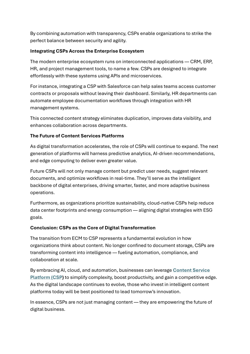 By combining automation with transparency, CSPs enable organizations to strike the perfect balance between security and agility. Integrating CSPs Across the Enterprise Ecosystem The modern enterprise ecosystem runs on interconnected applications — CRM, ERP, HR, and project management tools, to name a few. CSPs are designed to integrate effortlessly with these systems using APIs and microservices. For instance, integrating a CSP with Salesforce can help sales teams access customer contracts or proposals without leaving their dashboard. Similarly, HR departments can automate employee documentation workflows through integration with HR management systems. This connected content strategy eliminates duplication, improves data visibility, and enhances collaboration across departments. The Future of Content Services Platforms As digital transformation accelerates, the role of CSPs will continue to expand. The next generation of platforms will harness predictive analytics, AI-driven recommendations, and edge computing to deliver even greater value. Future CSPs will not only manage content but predict user needs, suggest relevant documents, and optimize workflows in real-time. They’ll serve as the intelligent backbone of digital enterprises, driving smarter, faster, and more adaptive business operations. Furthermore, as organizations prioritize sustainability, cloud-native CSPs help reduce data center footprints and energy consumption — aligning digital strategies with ESG goals. Conclusion: CSPs as the Core of Digital Transformation The transition from ECM to CSP represents a fundamental evolution in how organizations think about content. No longer confined to document storage, CSPs are transforming content into intelligence — fueling automation, compliance, and collaboration at scale. By embracing AI, cloud, and automation, businesses can leverage Content Service Platform (CSP) to simplify complexity, boost productivity, and gain a competitive edge. As the digital landscape continues to evolve, those who invest in intelligent content platforms today will be best positioned to lead tomorrow’s innovation. In essence, CSPs are not just managing content — they are empowering the future of digital business.