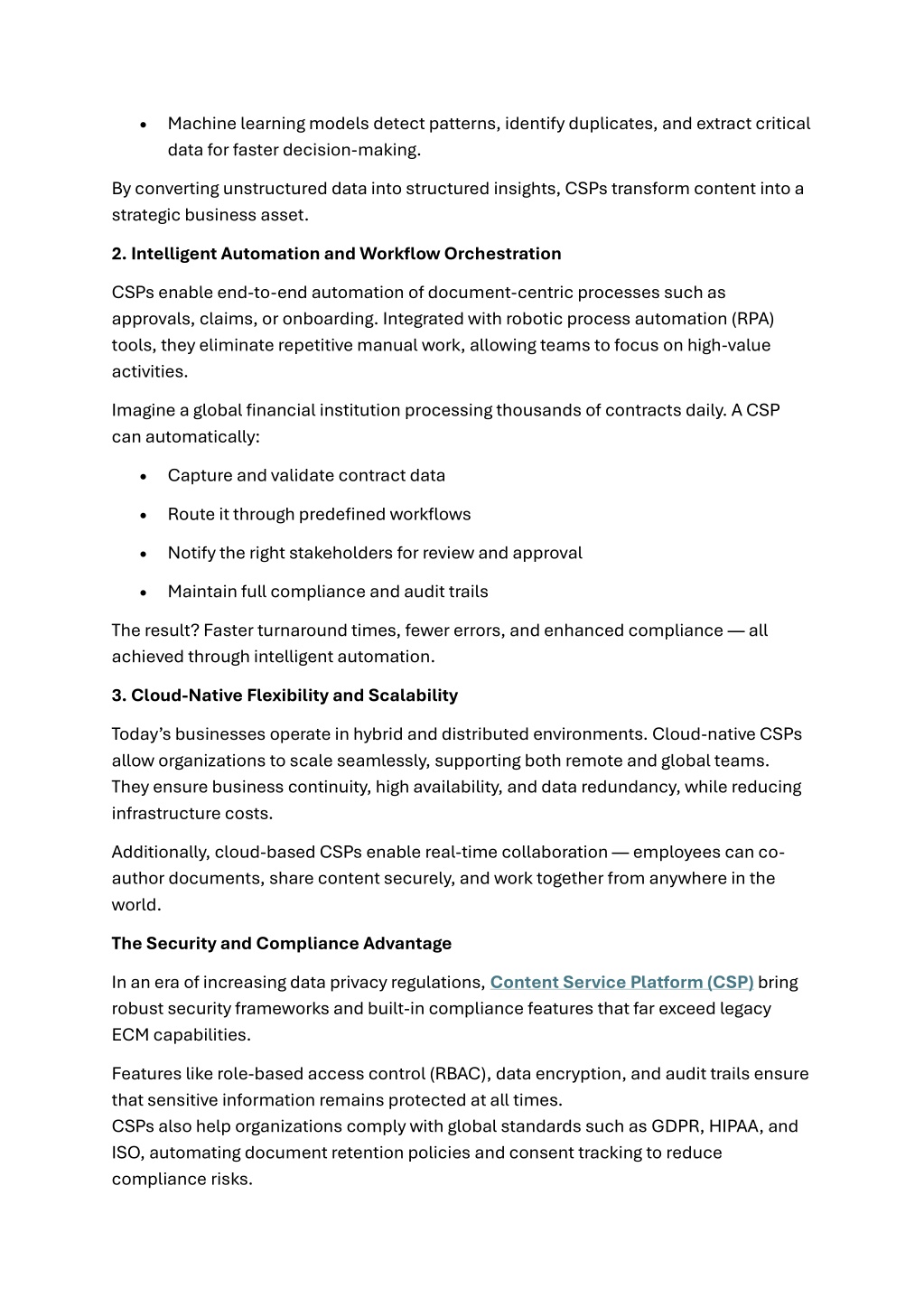 •Machine learning models detect patterns, identify duplicates, and extract critical data for faster decision-making. By converting unstructured data into structured insights, CSPs transform content into a strategic business asset. 2. Intelligent Automation and Workflow Orchestration CSPs enable end-to-end automation of document-centric processes such as approvals, claims, or onboarding. Integrated with robotic process automation (RPA) tools, they eliminate repetitive manual work, allowing teams to focus on high-value activities. Imagine a global financial institution processing thousands of contracts daily. A CSP can automatically: •Capture and validate contract data •Route it through predefined workflows •Notify the right stakeholders for review and approval •Maintain full compliance and audit trails The result? Faster turnaround times, fewer errors, and enhanced compliance — all achieved through intelligent automation. 3. Cloud-Native Flexibility and Scalability Today’s businesses operate in hybrid and distributed environments. Cloud-native CSPs allow organizations to scale seamlessly, supporting both remote and global teams. They ensure business continuity, high availability, and data redundancy, while reducing infrastructure costs. Additionally, cloud-based CSPs enable real-time collaboration — employees can co- author documents, share content securely, and work together from anywhere in the world. The Security and Compliance Advantage In an era of increasing data privacy regulations, Content Service Platform (CSP) bring robust security frameworks and built-in compliance features that far exceed legacy ECM capabilities. Features like role-based access control (RBAC), data encryption, and audit trails ensure that sensitive information remains protected at all times. CSPs also help organizations comply with global standards such as GDPR, HIPAA, and ISO, automating document retention policies and consent tracking to reduce compliance risks.