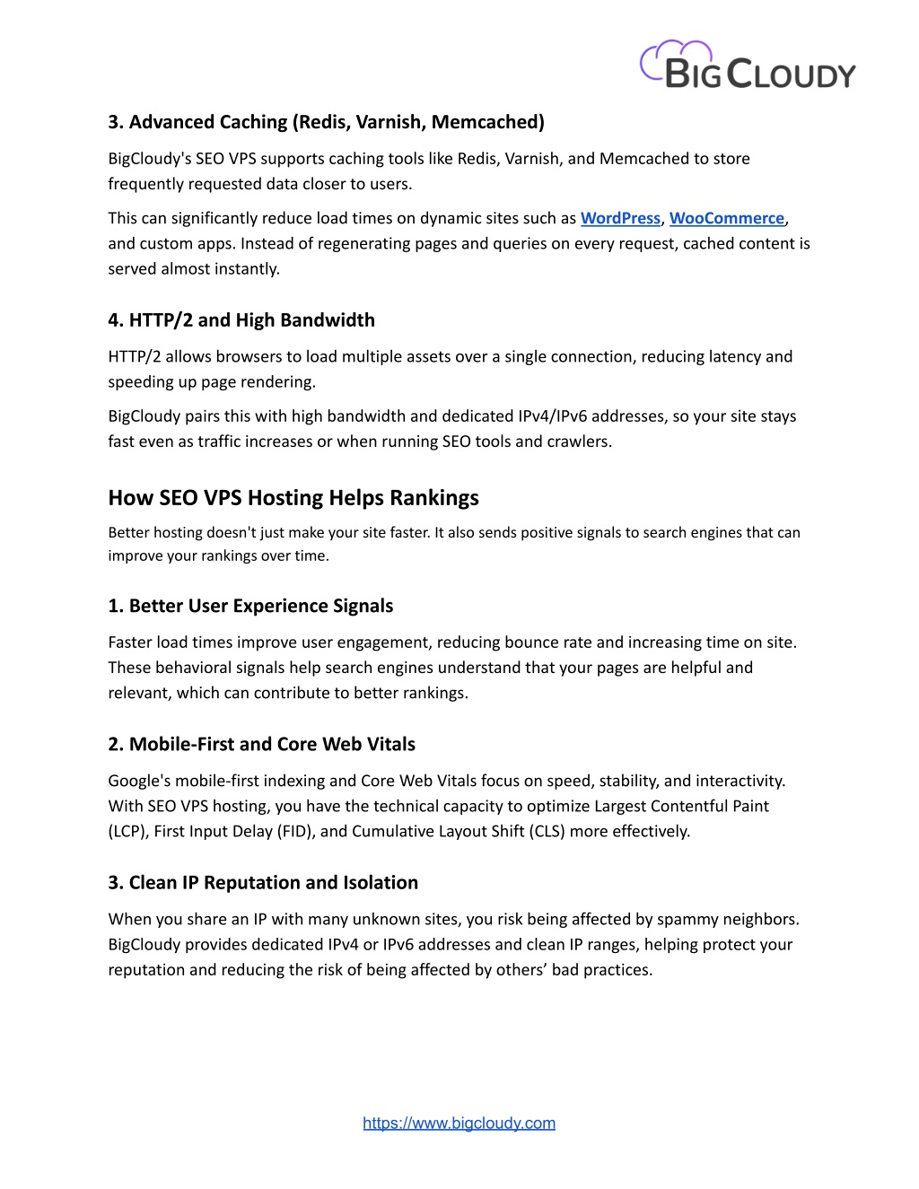 3. 3. Advanced Caching (Redis, Varnish, Memcached) BigCloudy's SEO VPS supports caching tools like Redis, Varnish, and Memcached to store frequently requested data closer to users. This can significantly reduce load times on dynamic sites such as WordPress, WooCommerce, and custom apps. Instead of regenerating pages and queries on every request, cached content is served almost instantly. 4. HTTP/2 and High Bandwidth HTTP/2 allows browsers to load multiple assets over a single connection, reducing latency and speeding up page rendering. BigCloudy pairs this with high bandwidth and dedicated IPv4/IPv6 addresses, so your site stays fast even as traffic increases or when running SEO tools and crawlers. How SEO VPS Hosting Helps Rankings Better hosting doesn't just make your site faster. It also sends positive signals to search engines that can improve your rankings over time. 1. Better User Experience Signals Faster load times improve user engagement, reducing bounce rate and increasing time on site. These behavioral signals help search engines understand that your pages are helpful and relevant, which can contribute to better rankings. 2. Mobile-First and Core Web Vitals Google's mobile-first indexing and Core Web Vitals focus on speed, stability, and interactivity. With SEO VPS hosting, you have the technical capacity to optimize Largest Contentful Paint (LCP), First Input Delay (FID), and Cumulative Layout Shift (CLS) more effectively. 3. Clean IP Reputation and Isolation When you share an IP with many unknown sites, you risk being affected by spammy neighbors. BigCloudy provides dedicated IPv4 or IPv6 addresses and clean IP ranges, helping protect your reputation and reducing the risk of being affected by others’ bad practices. https://www.bigcloudy.com