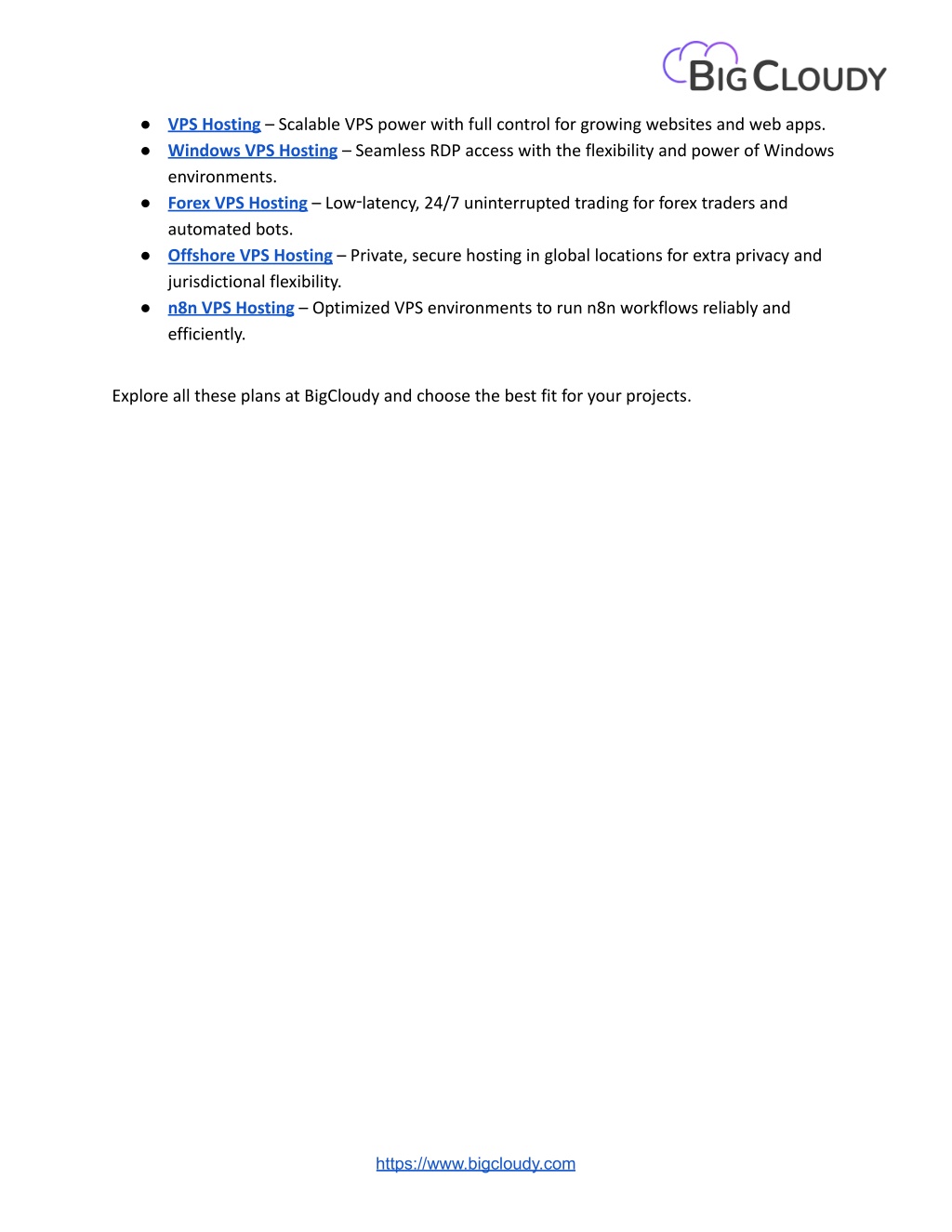 6. ● VPS Hosting – Scalable VPS power with full control for growing websites and web apps. ● Windows VPS Hosting – Seamless RDP access with the flexibility and power of Windows environments. ● Forex VPS Hosting – Low‑latency, 24/7 uninterrupted trading for forex traders and automated bots. ● Offshore VPS Hosting – Private, secure hosting in global locations for extra privacy and jurisdictional flexibility. ● n8n VPS Hosting – Optimized VPS environments to run n8n workflows reliably and efficiently. Explore all these plans at BigCloudy and choose the best fit for your projects. https://www.bigcloudy.com