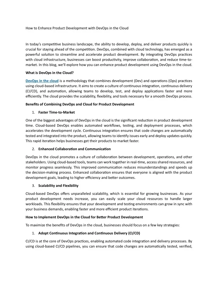 How to Enhance Product Development with DevOps in the Cloud In today’s competitive business landscape, the ability to develop, deploy, and deliver products quickly is crucial for staying ahead of the competition. DevOps, combined with cloud technology, has emerged as a powerful solution to streamline and accelerate product development. By integrating DevOps practices with cloud infrastructure, businesses can boost productivity, improve collaboration, and reduce time-to- market. In this blog, we'll explore how you can enhance product development using DevOps in the cloud. What is DevOps in the Cloud? DevOps in the cloud is a methodology that combines development (Dev) and operations (Ops) practices using cloud-based infrastructure. It aims to create a culture of continuous integration, continuous delivery (CI/CD), and automation, allowing teams to develop, test, and deploy applications faster and more efficiently. The cloud provides the scalability, flexibility, and tools necessary for a smooth DevOps process. Benefits of Combining DevOps and Cloud for Product Development 1.Faster Time-to-Market One of the biggest advantages of DevOps in the cloud is the significant reduction in product development time. Cloud-based DevOps enables automated workflows, testing, and deployment processes, which accelerates the development cycle. Continuous integration ensures that code changes are automatically tested and integrated into the product, allowing teams to identify issues early and deploy updates quickly. This rapid iteration helps businesses get their products to market faster. 2.Enhanced Collaboration and Communication DevOps in the cloud promotes a culture of collaboration between development, operations, and other stakeholders. Using cloud-based tools, teams can work together in real-time, access shared resources, and monitor progress seamlessly. This improved communication reduces misunderstandings and speeds up the decision-making process. Enhanced collaboration ensures that everyone is aligned with the product development goals, leading to higher efficiency and better outcomes. 3.Scalability and Flexibility Cloud-based DevOps offers unparalleled scalability, which is essential for growing businesses. As your product development needs increase, you can easily scale your cloud resources to handle larger workloads. This flexibility ensures that your development and testing environments can grow in sync with your business demands, enabling faster and more efficient product iterations. How to Implement DevOps in the Cloud for Better Product Development To maximize the benefits of DevOps in the cloud, businesses should focus on a few key strategies: 1.Adopt Continuous Integration and Continuous Delivery (CI/CD) CI/CD is at the core of DevOps practices, enabling automated code integration and delivery processes. By using cloud-based CI/CD pipelines, you can ensure that code changes are automatically tested, verified,