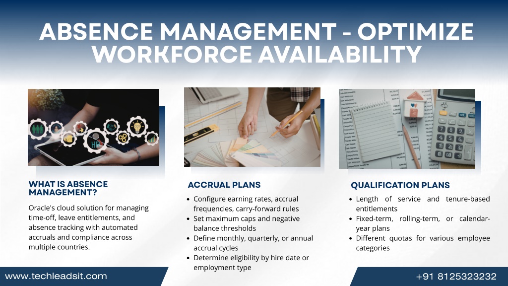 5. ABSENCE MANAGEMENT - OPTIMIZE WORKFORCE AVAILABILITY WORKFORCE AVAILABILITY ABSENCE MANAGEMENT - OPTIMIZE WHAT IS ABSENCE MANAGEMENT? ACCRUAL PLANS QUALIFICATION PLANS Configure earning rates, accrual frequencies, carry-forward rules Set maximum caps and negative balance thresholds Define monthly, quarterly, or annual accrual cycles Determine eligibility by hire date or employment type Length of service and tenure-based entitlements Fixed-term, rolling-term, or calendar- year plans Different quotas for various employee categories Oracle's cloud solution for managing time-off, leave entitlements, and absence tracking with automated accruals and compliance across multiple countries. www.techleadsit.com +91 8125323232