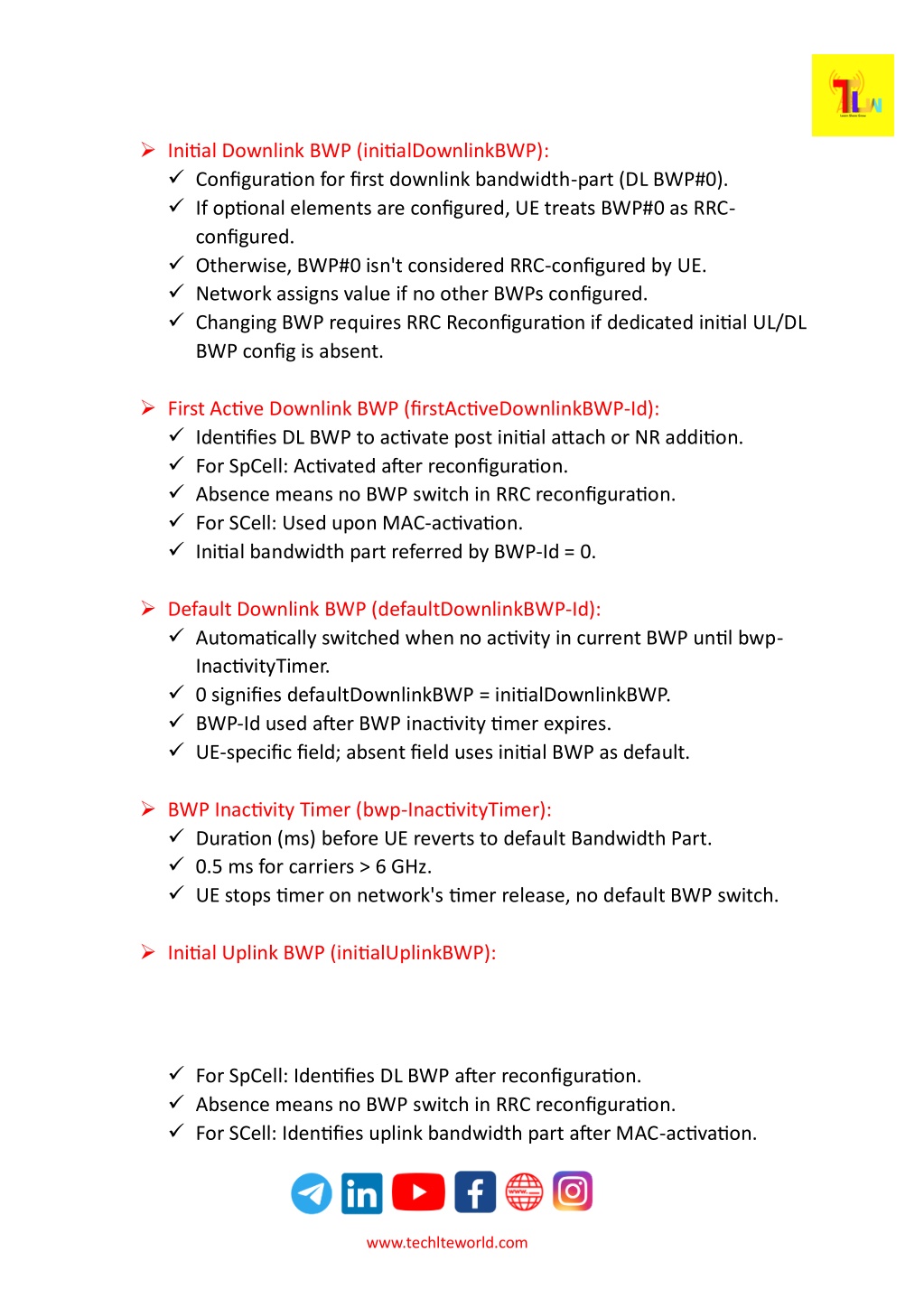 ➢Initial Downlink BWP (initialDownlinkBWP): ✓Configuration for first downlink bandwidth-part (DL BWP#0). ✓If optional elements are configured, UE treats BWP#0 as RRC- configured. ✓Otherwise, BWP#0 isn't considered RRC-configured by UE. ✓Network assigns value if no other BWPs configured. ✓Changing BWP requires RRC Reconfiguration if dedicated initial UL/DL BWP config is absent. ➢First Active Downlink BWP (firstActiveDownlinkBWP-Id): ✓Identifies DL BWP to activate post initial attach or NR addition. ✓For SpCell: Activated after reconfiguration. ✓Absence means no BWP switch in RRC reconfiguration. ✓For SCell: Used upon MAC-activation. ✓Initial bandwidth part referred by BWP-Id = 0. ➢Default Downlink BWP (defaultDownlinkBWP-Id): ✓Automatically switched when no activity in current BWP until bwp- InactivityTimer. ✓0 signifies defaultDownlinkBWP = initialDownlinkBWP. ✓BWP-Id used after BWP inactivity timer expires. ✓UE-specific field; absent field uses initial BWP as default. ➢BWP Inactivity Timer (bwp-InactivityTimer): ✓Duration (ms) before UE reverts to default Bandwidth Part. ✓0.5 ms for carriers > 6 GHz. ✓UE stops timer on network's timer release, no default BWP switch. ➢Initial Uplink BWP (initialUplinkBWP): ✓For SpCell: Identifies DL BWP after reconfiguration. ✓Absence means no BWP switch in RRC reconfiguration. ✓For SCell: Identifies uplink bandwidth part after MAC-activation. www.techlteworld.com