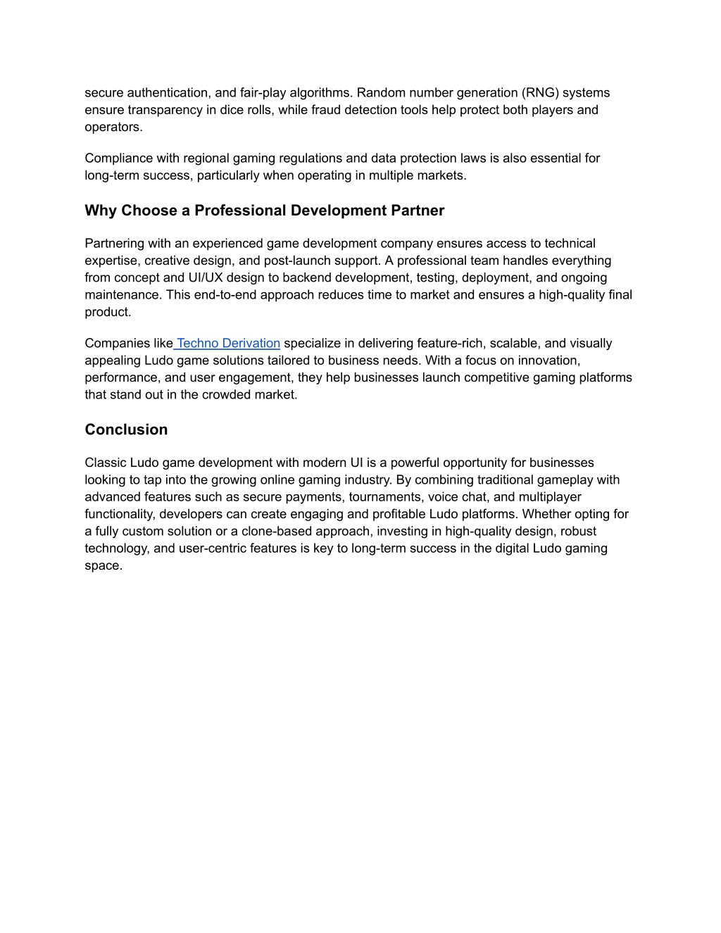 secure authentication, and fair-play algorithms. Random number generation (RNG) systems ensure transparency in dice rolls, while fraud detection tools help protect both players and operators. Compliance with regional gaming regulations and data protection laws is also essential for long-term success, particularly when operating in multiple markets. Why Choose a Professional Development Partner Partnering with an experienced game development company ensures access to technical expertise, creative design, and post-launch support. A professional team handles everything from concept and UI/UX design to backend development, testing, deployment, and ongoing maintenance. This end-to-end approach reduces time to market and ensures a high-quality final product. Companies like Techno Derivation specialize in delivering feature-rich, scalable, and visually appealing Ludo game solutions tailored to business needs. With a focus on innovation, performance, and user engagement, they help businesses launch competitive gaming platforms that stand out in the crowded market. Conclusion Classic Ludo game development with modern UI is a powerful opportunity for businesses looking to tap into the growing online gaming industry. By combining traditional gameplay with advanced features such as secure payments, tournaments, voice chat, and multiplayer functionality, developers can create engaging and profitable Ludo platforms. Whether opting for a fully custom solution or a clone-based approach, investing in high-quality design, robust technology, and user-centric features is key to long-term success in the digital Ludo gaming space.