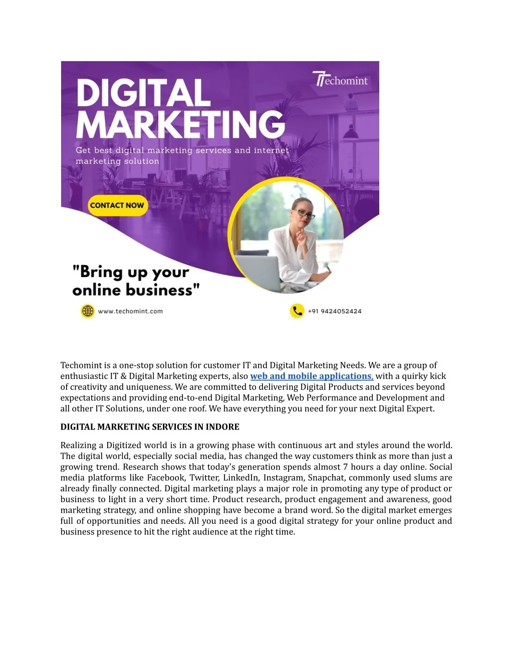 Techomint is a one-stop solution for customer IT and Digital Marketing Needs. We are a group of enthusiastic IT & Digital Marketing experts, also web and mobile applications, with a quirky kick of creativity and uniqueness. We are committed to delivering Digital Products and services beyond expectations and providing end-to-end Digital Marketing, Web Performance and Development and all other IT Solutions, under one roof. We have everything you need for your next Digital Expert. DIGITAL MARKETING SERVICES IN INDORE Realizing a Digitized world is in a growing phase with continuous art and styles around the world. The digital world, especially social media, has changed the way customers think as more than just a growing trend. Research shows that today's generation spends almost 7 hours a day online. Social media platforms like Facebook, Twitter, LinkedIn, Instagram, Snapchat, commonly used slums are already finally connected. Digital marketing plays a major role in promoting any type of product or business to light in a very short time. Product research, product engagement and awareness, good marketing strategy, and online shopping have become a brand word. So the digital market emerges full of opportunities and needs. All you need is a good digital strategy for your online product and business presence to hit the right audience at the right time.