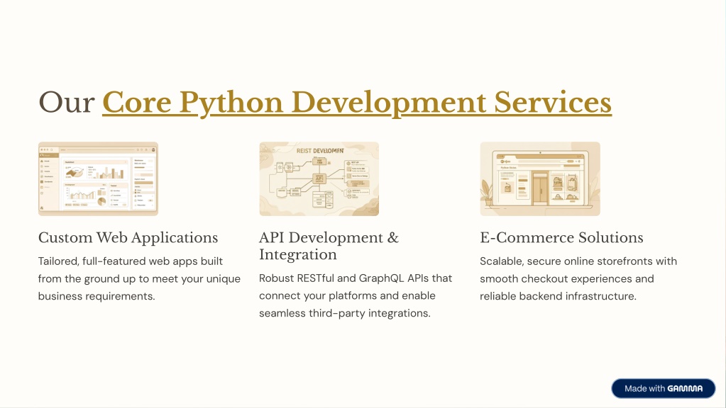 Our Core Python Development Services Custom Web Applications API Development & Integration E-Commerce Solutions Tailored, full-featured web apps built from the ground up to meet your unique business requirements. Scalable, secure online storefronts with smooth checkout experiences and reliable backend infrastructure. Robust RESTful and GraphQL APIs that connect your platforms and enable seamless third-party integrations.