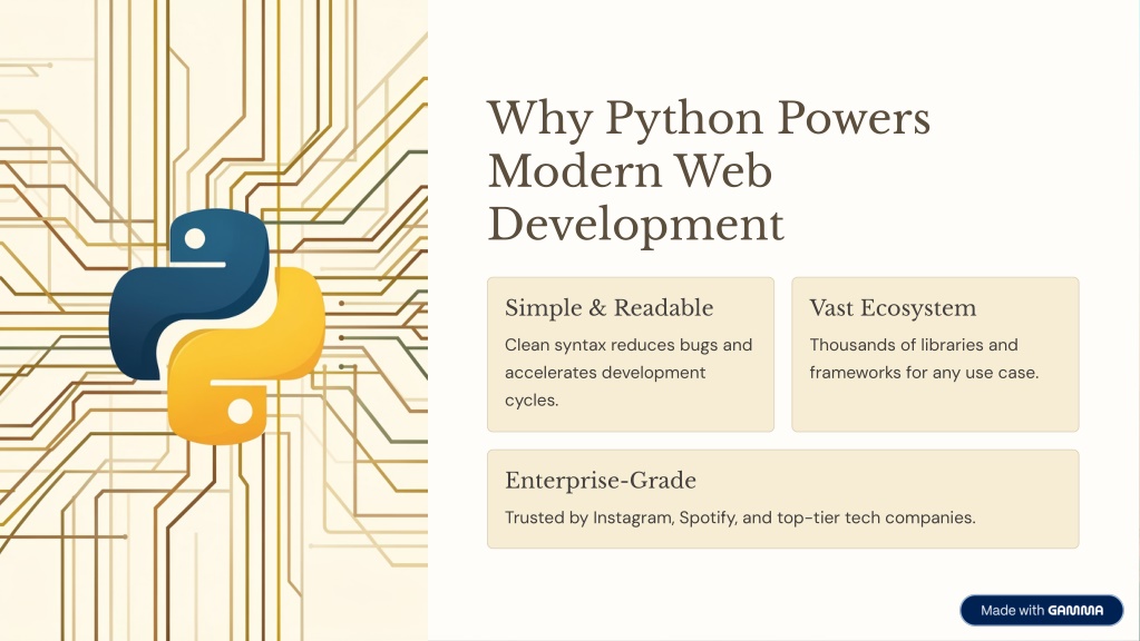 Why Python Powers Modern Web Development Simple & Readable Vast Ecosystem Clean syntax reduces bugs and accelerates development cycles. Thousands of libraries and frameworks for any use case. Enterprise-Grade Trusted by Instagram, Spotify, and top-tier tech companies.