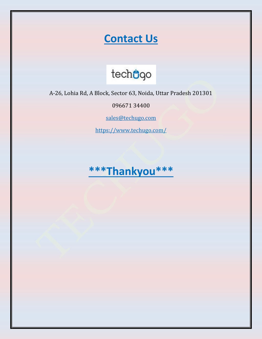 Contact Us A-26, Lohia Rd, A Block, Sector 63, Noida, Uttar Pradesh 201301 096671 34400 sales@techugo.com https://www.techugo.com/ ***Thankyou***