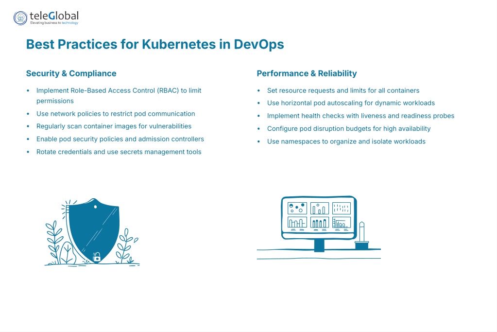 Best Practices for Kubernetes in DevOps Security & Compliance Performance & Reliability Implement Role-Based Access Control (RBAC) to limit permissions Set resource requests and limits for all containers Use horizontal pod autoscaling for dynamic workloads Use network policies to restrict pod communication Implement health checks with liveness and readiness probes Regularly scan container images for vulnerabilities Configure pod disruption budgets for high availability Enable pod security policies and admission controllers Use namespaces to organize and isolate workloads Rotate credentials and use secrets management tools