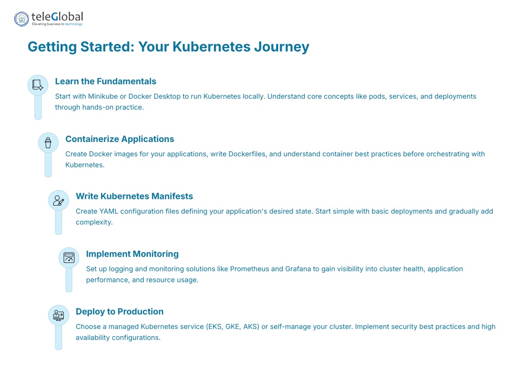 Getting Started: Your Kubernetes Journey Learn the Fundamentals Start with Minikube or Docker Desktop to run Kubernetes locally. Understand core concepts like pods, services, and deployments through hands-on practice. Containerize Applications Create Docker images for your applications, write Dockerfiles, and understand container best practices before orchestrating with Kubernetes. Write Kubernetes Manifests Create YAML configuration files defining your application's desired state. Start simple with basic deployments and gradually add complexity. Implement Monitoring Set up logging and monitoring solutions like Prometheus and Grafana to gain visibility into cluster health, application performance, and resource usage. Deploy to Production Choose a managed Kubernetes service (EKS, GKE, AKS) or self-manage your cluster. Implement security best practices and high availability configurations.