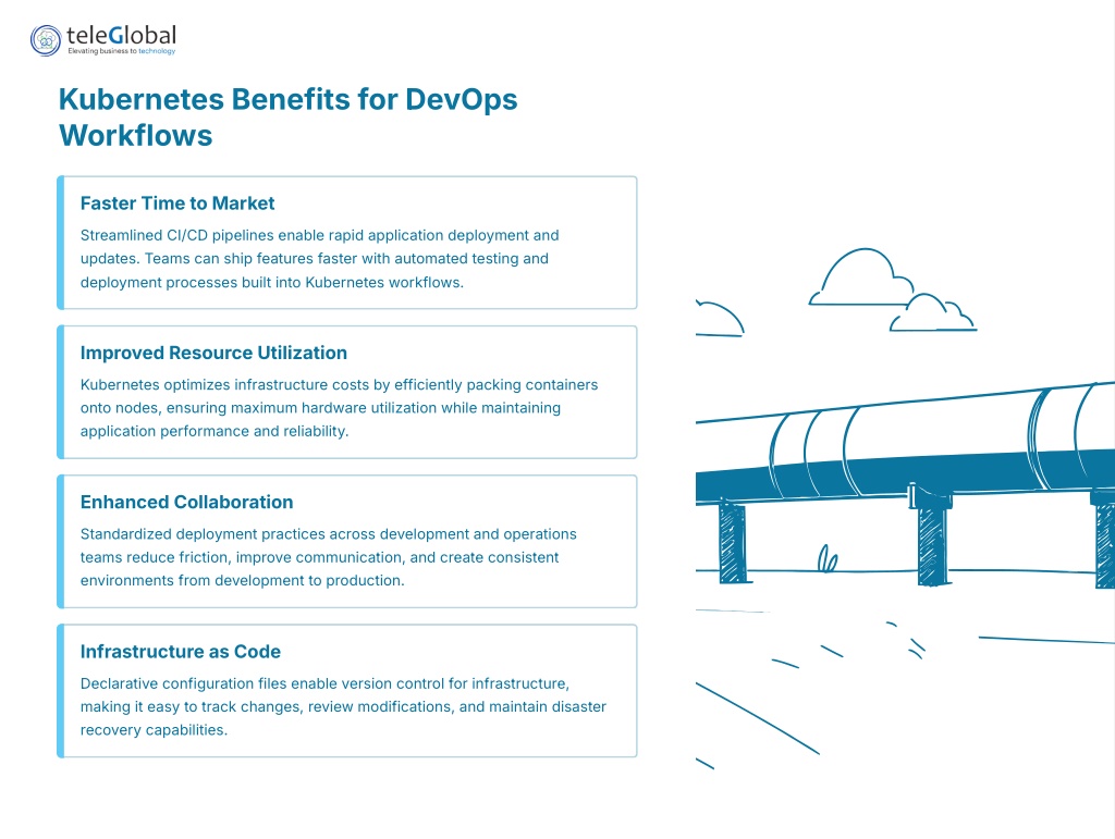 Kubernetes Benefits for DevOps Workflows Faster Time to Market Streamlined CI/CD pipelines enable rapid application deployment and updates. Teams can ship features faster with automated testing and deployment processes built into Kubernetes workflows. Improved Resource Utilization Kubernetes optimizes infrastructure costs by efficiently packing containers onto nodes, ensuring maximum hardware utilization while maintaining application performance and reliability. Enhanced Collaboration Standardized deployment practices across development and operations teams reduce friction, improve communication, and create consistent environments from development to production. Infrastructure as Code Declarative configuration files enable version control for infrastructure, making it easy to track changes, review modifications, and maintain disaster recovery capabilities.
