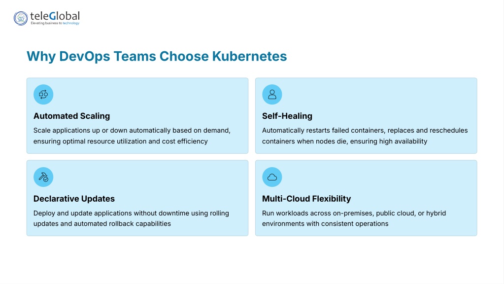 Start Your Kubernetes Journey Today Kubernetes empowers DevOps teams to build resilient, scalable infrastructure that accelerates innovation and reduces operational complexity. Whether you're just beginning your container orchestration journey or optimizing existing deployments, the right expertise makes all the difference. Connect With Kubernetes Experts Get personalized guidance for your DevOps transformation. Our specialists are ready to help you leverage Kubernetes for maximum impact. hello@teleglobals.com | ? +91-9513631005 ? https://teleglobals.com/blog/kubernetes-for-devops ?