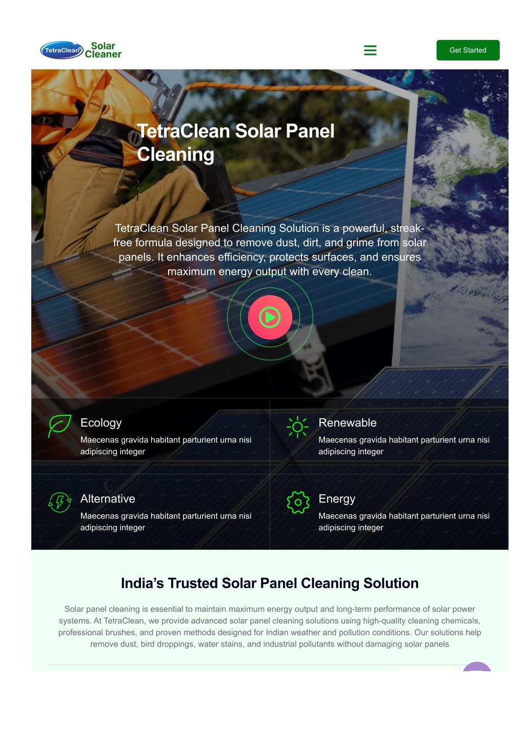 Get Started TetraClean Solar Panel Cleaning S TetraClean Solar Panel Cleaning Solution is a powerful, streak- free formula designed to remove dust, dirt, and grime from solar panels. It enhances efficiency, protects surfaces, and ensures maximum energy output with every clean. Ecology Renewable Maecenas gravida habitant parturient urna nisi adipiscing integer Maecenas gravida habitant parturient urna nisi adipiscing integer Alternative Energy Maecenas gravida habitant parturient urna nisi adipiscing integer Maecenas gravida habitant parturient urna nisi adipiscing integer India’s Trusted Solar Panel Cleaning Solution Solar panel cleaning is essential to maintain maximum energy output and long-term performance of solar power systems. At TetraClean, we provide advanced solar panel cleaning solutions using high-quality cleaning chemicals, professional brushes, and proven methods designed for Indian weather and pollution conditions. Our solutions help remove dust, bird droppings, water stains, and industrial pollutants without damaging solar panels