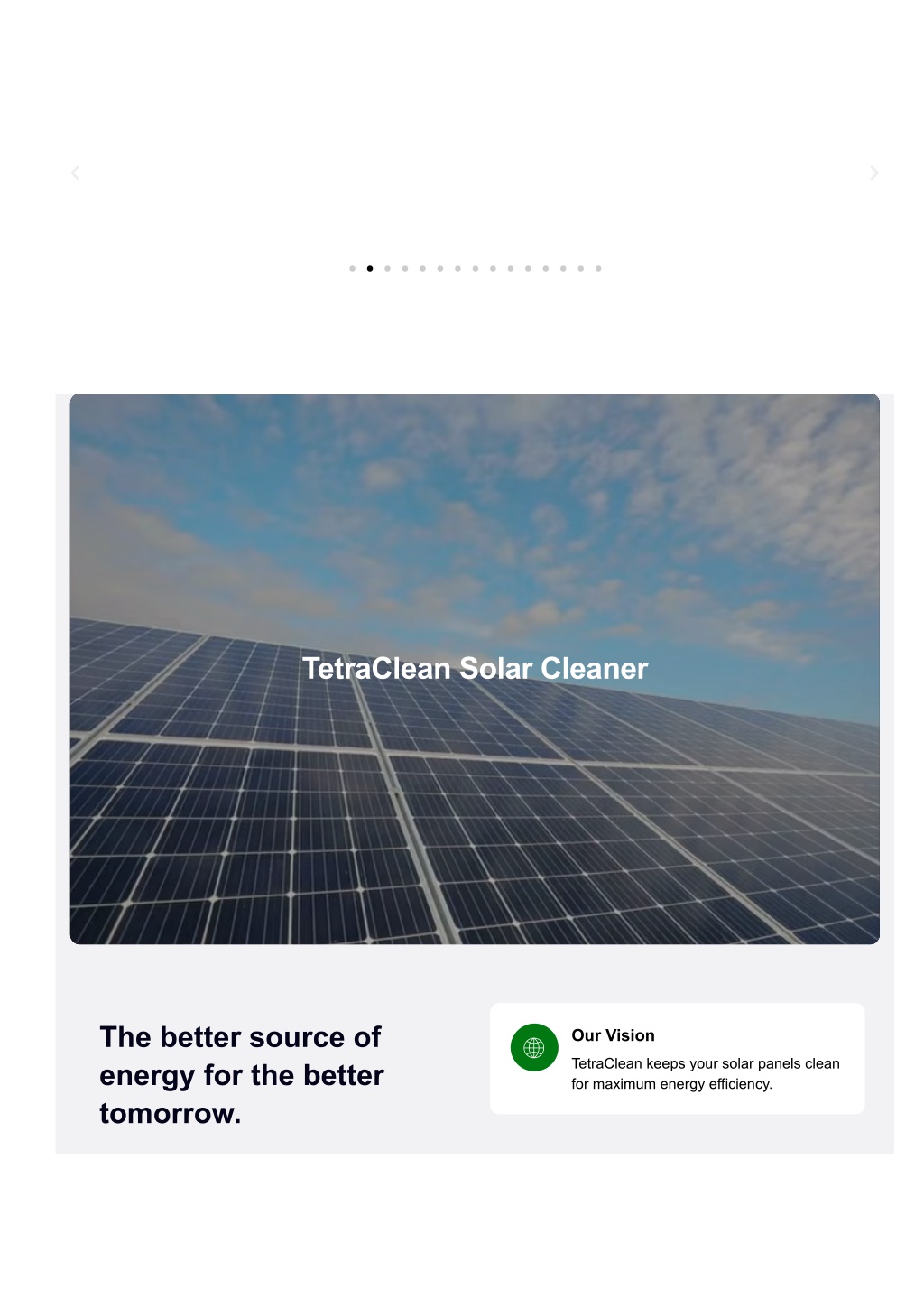 TetraClean Solar Cleaner The better source of energy for the better tomorrow. Our Vision TetraClean keeps your solar panels clean for maximum energy efficiency.