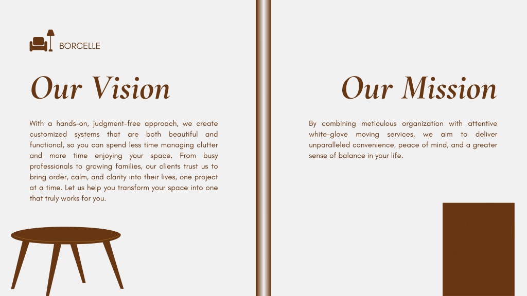 BORCELLE Our Vision Our Mission With a hands-on, judgment-free approach, we create customized systems that are both beautiful and functional, so you can spend less time managing clutter and more time enjoying your space. From busy professionals to growing families, our clients trust us to bring order, calm, and clarity into their lives, one project at a time. Let us help you transform your space into one that truly works for you. By combining meticulous organization with attentive white-glove moving services, we aim to deliver unparalleled convenience, peace of mind, and a greater sense of balance in your life.