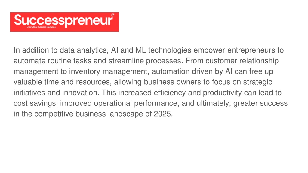 The year 2025 marks a pivotal moment for SuccesspreneurBusiness, as the landscape is on the brink of a revolutionary transformation driven by the integration of artificial intelligence (AI) and machine learning (ML) technologies. These cutting-edge advancements are set to redefine the way entrepreneurs approach business operations, strategic decision-making, and overall success.