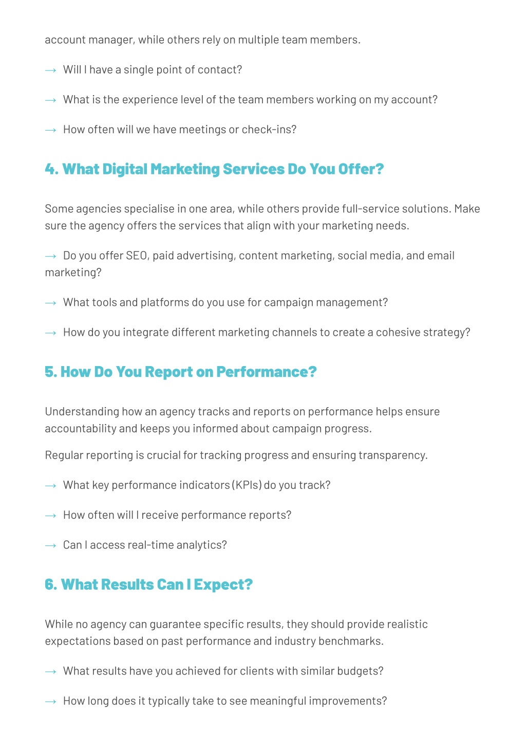 account manager, while others rely on multiple team members. → Will I have a single point of contact? → What is the experience level of the team members working on my account? → How often will we have meetings or check-ins? 4. What Digital Marketing Services Do You Offer? Some agencies specialise in one area, while others provide full-service solutions. Make sure the agency offers the services that align with your marketing needs. → Do you offer SEO, paid advertising, content marketing, social media, and email marketing? → What tools and platforms do you use for campaign management? → How do you integrate different marketing channels to create a cohesive strategy? 5. How Do You Report on Performance? Understanding how an agency tracks and reports on performance helps ensure accountability and keeps you informed about campaign progress. Regular reporting is crucial for tracking progress and ensuring transparency. → What key performance indicators (KPIs) do you track? → How often will I receive performance reports? → Can I access real-time analytics? 6. What Results Can I Expect? While no agency can guarantee speci?c results, they should provide realistic expectations based on past performance and industry benchmarks. → What results have you achieved for clients with similar budgets? → How long does it typically take to see meaningful improvements?