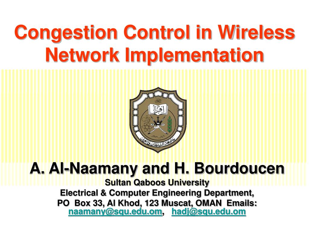 Congestion Control in Wireless Network Implementation A. Al-Naamany and H. Bourdoucen Sultan Qaboos University Electrical & Computer Engineering Department, PO Box 33, Al Khod, 123 Muscat, OMAN Emails: naamany@squ.edu.om, hadj@squ.edu.om