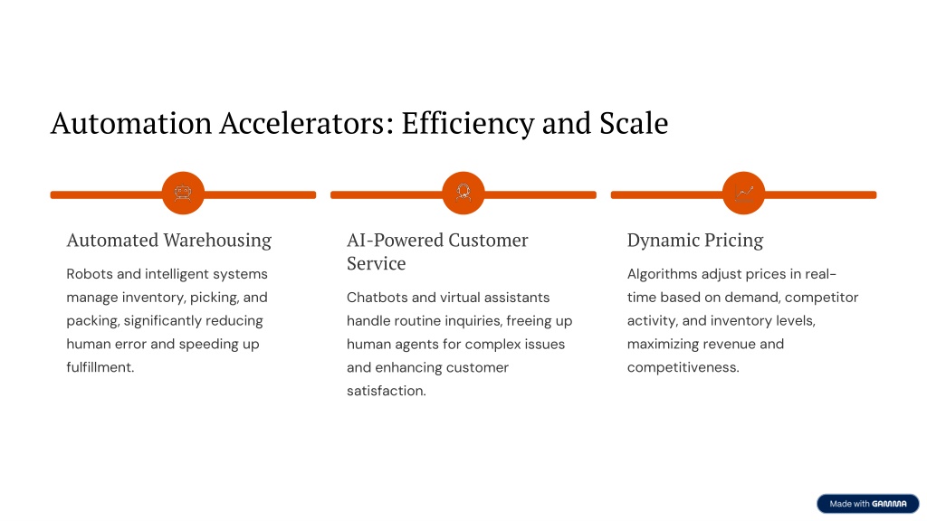 Automation Accelerators: Efficiency and Scale Automated Warehousing AI-Powered Customer Service Dynamic Pricing Robots and intelligent systems manage inventory, picking, and packing, significantly reducing human error and speeding up fulfillment. Algorithms adjust prices in real-time based on demand, competitor activity, and inventory levels, maximizing revenue and competitiveness. Chatbots and virtual assistants handle routine inquiries, freeing up human agents for complex issues and enhancing customer satisfaction.