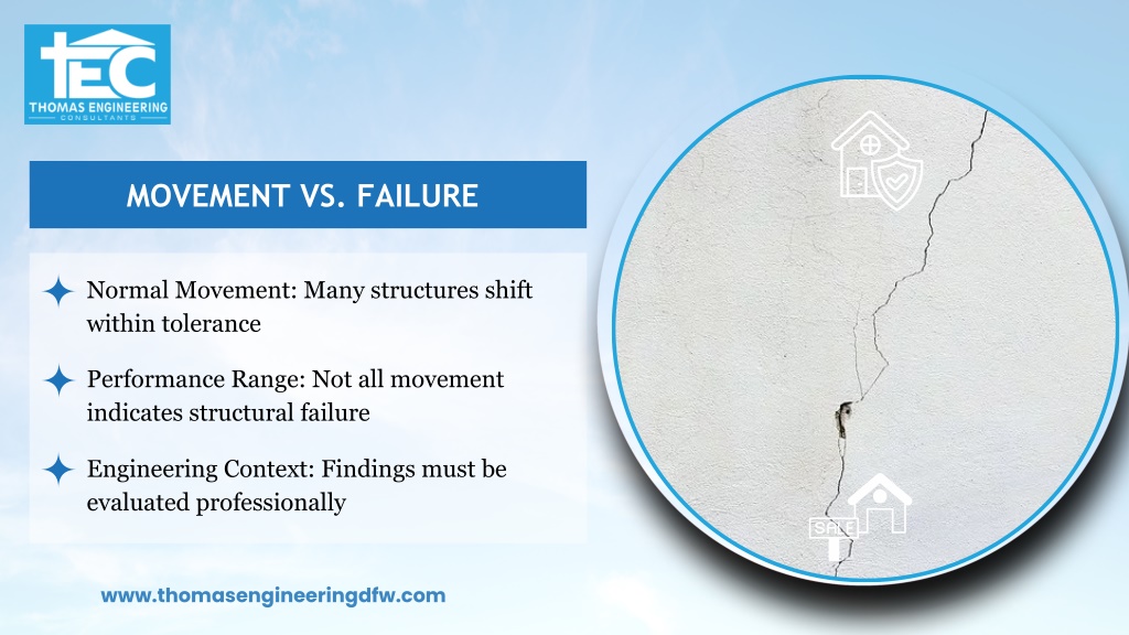 MOVEMENT VS. FAILURE Normal Movement: Many structures shift within tolerance Performance Range: Not all movement indicates structural failure Engineering Context: Findings must be evaluated professionally www.thomasengineeringdfw.com