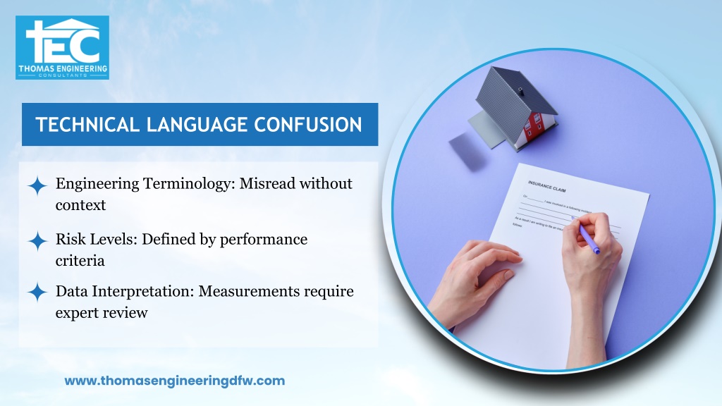 TECHNICAL LANGUAGE CONFUSION Engineering Terminology: Misread without context Risk Levels: Defined by performance criteria Data Interpretation: Measurements require expert review www.thomasengineeringdfw.com