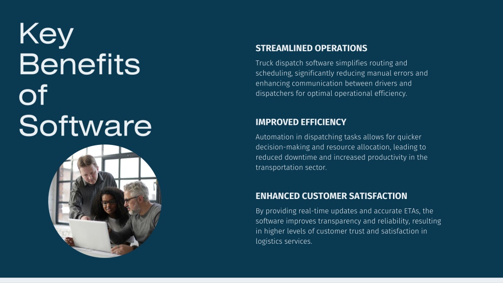 2. STREAMLINED OPERATIONS • IMPROVED EFFICIENCY • ENHANCED CUSTOMER SATISFACTION • Key Benefits of Software • Truck dispatch software simplifies routing and scheduling, significantly reducing manual errors and enhancing communication between drivers and dispatchers for optimal operational efficiency. • Automation in dispatching tasks allows for quicker decision-making and resource allocation, leading to reduced downtime and increased productivity in the transportation sector. • By providing real-time updates and accurate ETAs, the software improves transparency and reliability, resulting in higher levels of customer trust and satisfaction in logistics services.