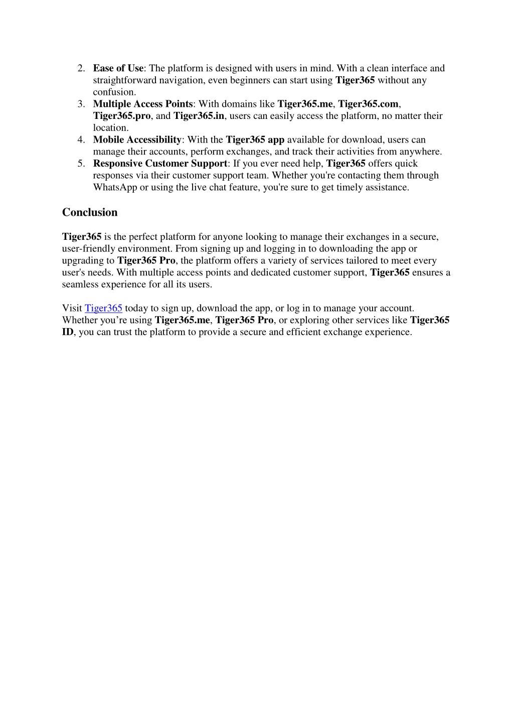 2.Ease of Use: The platform is designed with users in mind. With a clean interface and straightforward navigation, even beginners can start using Tiger365 without any confusion. 3.Multiple Access Points: With domains like Tiger365.me, Tiger365.com, Tiger365.pro, and Tiger365.in, users can easily access the platform, no matter their location. 4.Mobile Accessibility: With the Tiger365 app available for download, users can manage their accounts, perform exchanges, and track their activities from anywhere. 5.Responsive Customer Support: If you ever need help, Tiger365 offers quick responses via their customer support team. Whether you're contacting them through WhatsApp or using the live chat feature, you're sure to get timely assistance. Conclusion Tiger365 is the perfect platform for anyone looking to manage their exchanges in a secure, user-friendly environment. From signing up and logging in to downloading the app or upgrading to Tiger365 Pro, the platform offers a variety of services tailored to meet every user's needs. With multiple access points and dedicated customer support, Tiger365 ensures a seamless experience for all its users. Visit Tiger365 today to sign up, download the app, or log in to manage your account. Whether you’re using Tiger365.me, Tiger365 Pro, or exploring other services like Tiger365 ID, you can trust the platform to provide a secure and efficient exchange experience.