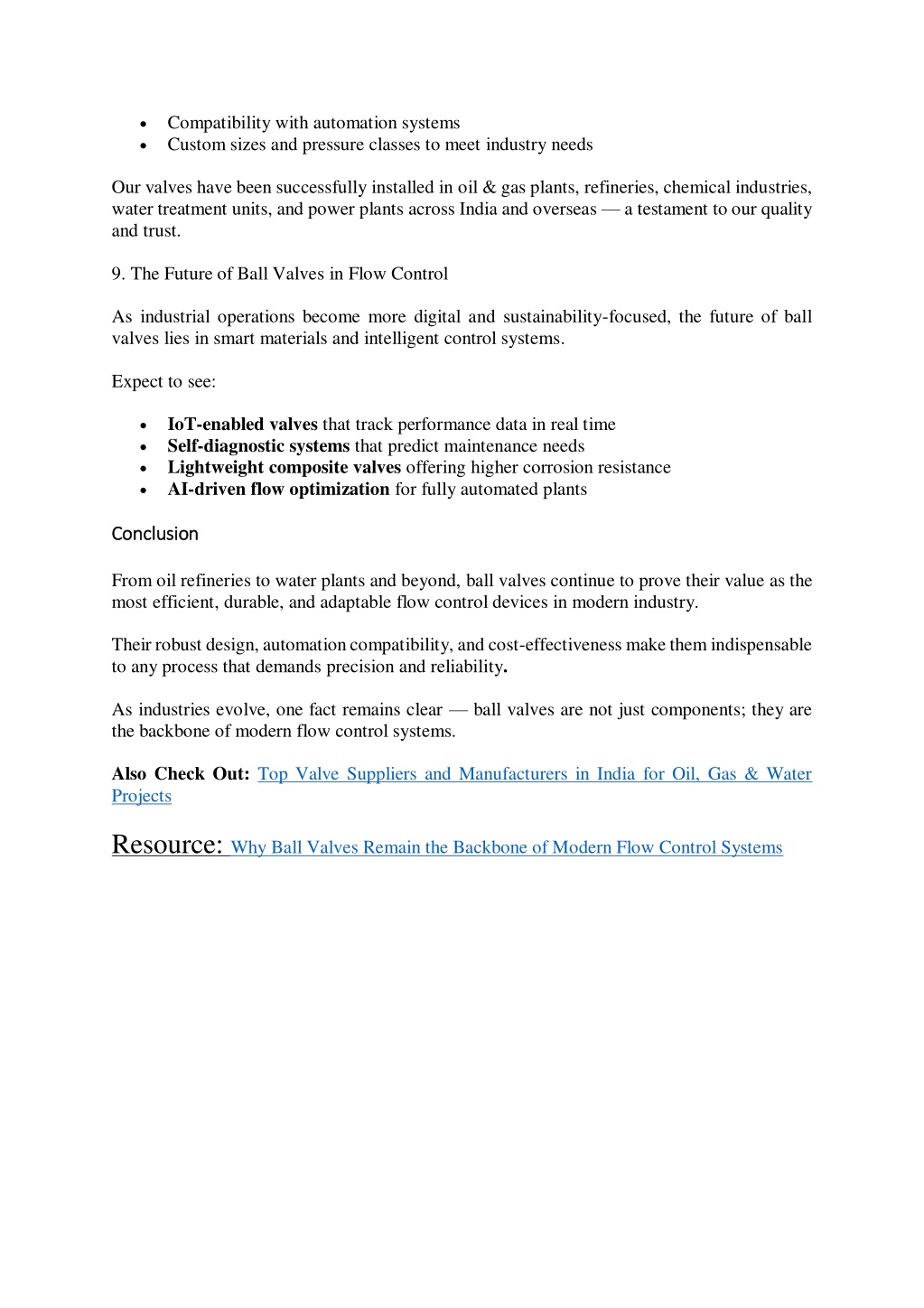 5. Compatibility with automation systems Custom sizes and pressure classes to meet industry needs Our valves have been successfully installed in oil & gas plants, refineries, chemical industries, water treatment units, and power plants across India and overseas — a testament to our quality and trust. 9. The Future of Ball Valves in Flow Control As industrial operations become more digital and sustainability-focused, the future of ball valves lies in smart materials and intelligent control systems. Expect to see: IoT-enabled valves that track performance data in real time Self-diagnostic systems that predict maintenance needs Lightweight composite valves offering higher corrosion resistance AI-driven flow optimization for fully automated plants Conclusion Conclusion From oil refineries to water plants and beyond, ball valves continue to prove their value as the most efficient, durable, and adaptable flow control devices in modern industry. Their robust design, automation compatibility, and cost-effectiveness make them indispensable to any process that demands precision and reliability. As industries evolve, one fact remains clear — ball valves are not just components; they are the backbone of modern flow control systems. Also Check Out: Top Valve Suppliers and Manufacturers in India for Oil, Gas & Water Projects Resource: Why Ball Valves Remain the Backbone of Modern Flow Control Systems