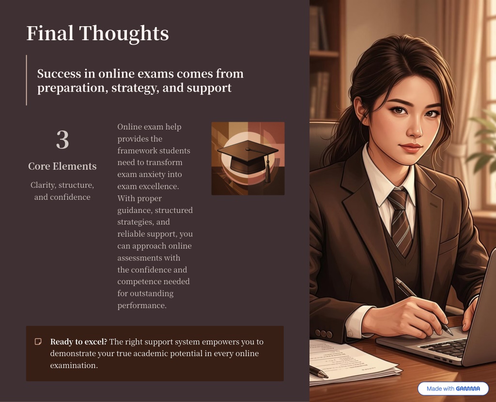 Final Thoughts Success in online exams comes from preparation, strategy, and support ? Online exam help provides the framework students need to transform exam anxiety into exam excellence. With proper guidance, structured strategies, and reliable support, you can approach online assessments with the confidence and competence needed for outstanding performance. Core Elements Clarity, structure, and confidence Ready to excel? The right support system empowers you to demonstrate your true academic potential in every online examination.