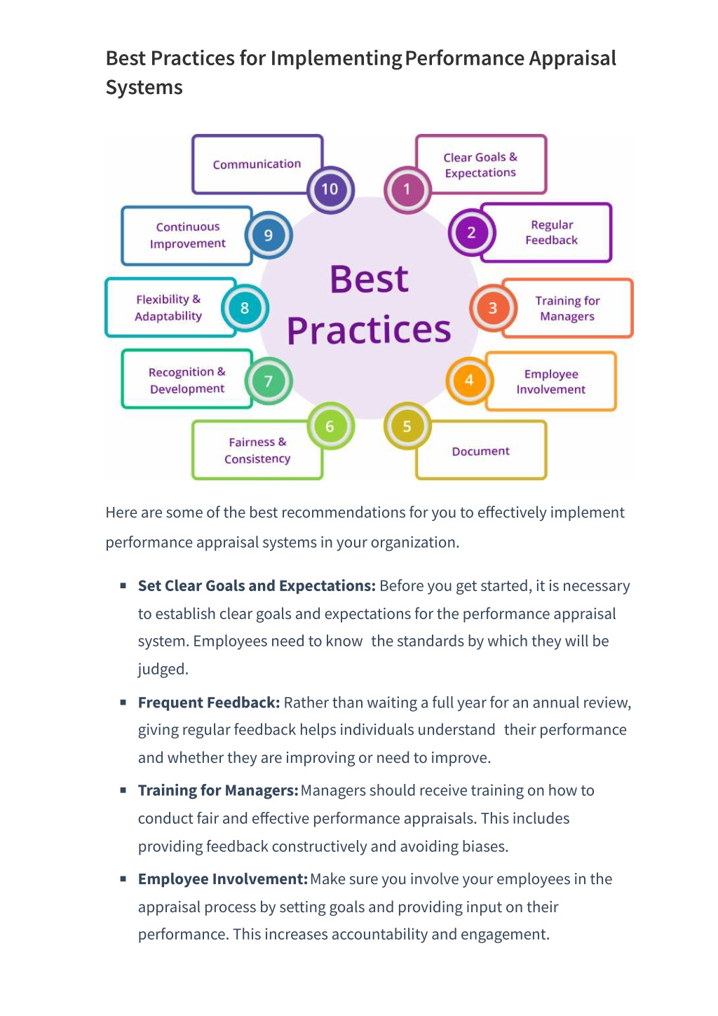 Best Practices for Implementing Performance Appraisal Systems Here are some of the best recommendations for you to e?ectively implement performance appraisal systems in your organization. Set Clear Goals and Expectations: Before you get started, it is necessary to establish clear goals and expectations for the performance appraisal system. Employees need to know the standards by which they will be judged. Frequent Feedback: Rather than waiting a full year for an annual review, giving regular feedback helps individuals understand their performance and whether they are improving or need to improve. Training for Managers: Managers should receive training on how to conduct fair and e?ective performance appraisals. This includes providing feedback constructively and avoiding biases. Employee Involvement: Make sure you involve your employees in the appraisal process by setting goals and providing input on their performance. This increases accountability and engagement.