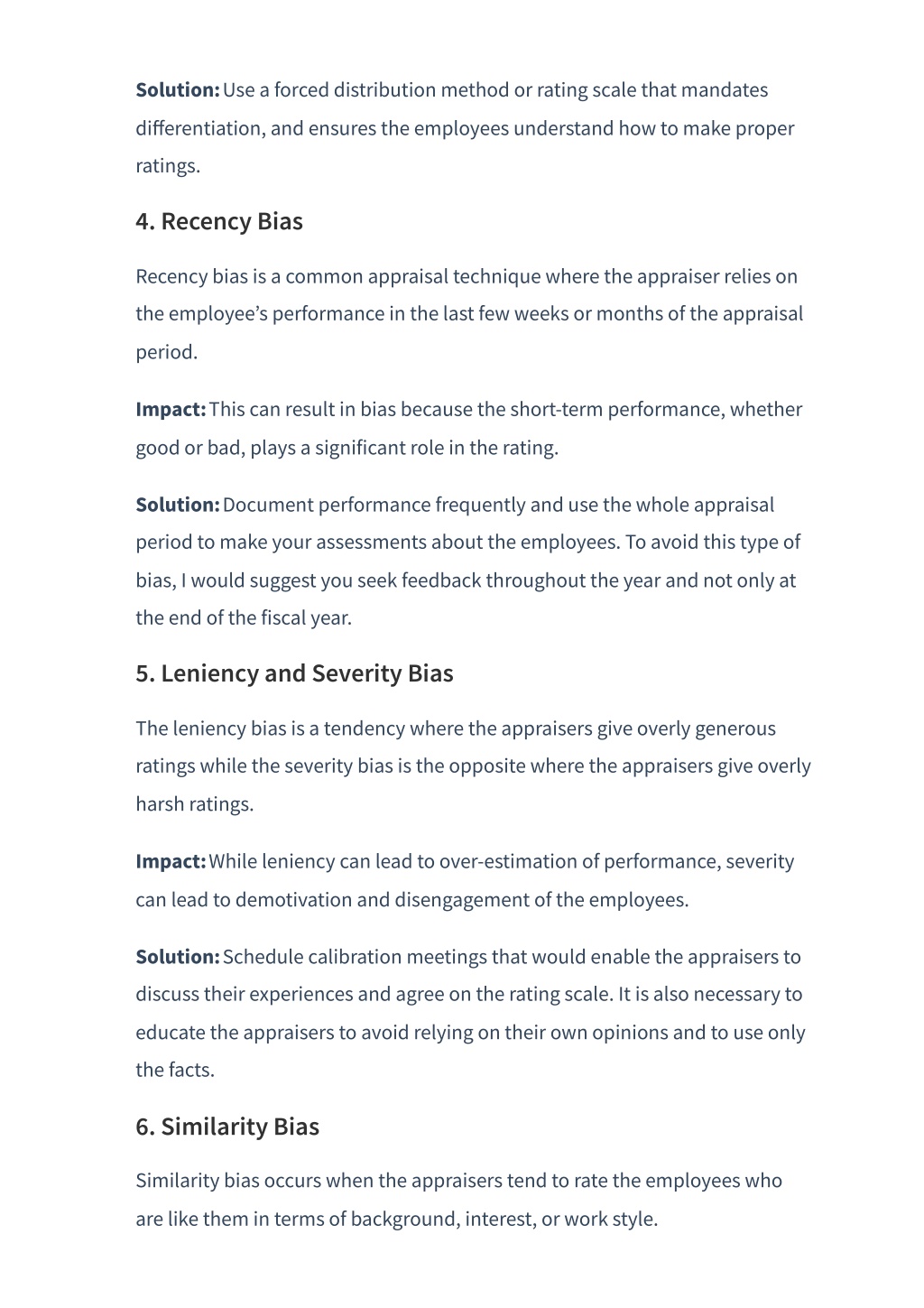 Solution: Use a forced distribution method or rating scale that mandates di?erentiation, and ensures the employees understand how to make proper ratings. 4. Recency Bias Recency bias is a common appraisal technique where the appraiser relies on the employeeʼs performance in the last few weeks or months of the appraisal period. Impact: This can result in bias because the short-term performance, whether good or bad, plays a significant role in the rating. Solution: Document performance frequently and use the whole appraisal period to make your assessments about the employees. To avoid this type of bias, I would suggest you seek feedback throughout the year and not only at the end of the fiscal year. 5. Leniency and Severity Bias The leniency bias is a tendency where the appraisers give overly generous ratings while the severity bias is the opposite where the appraisers give overly harsh ratings. Impact: While leniency can lead to over-estimation of performance, severity can lead to demotivation and disengagement of the employees. Solution: Schedule calibration meetings that would enable the appraisers to discuss their experiences and agree on the rating scale. It is also necessary to educate the appraisers to avoid relying on their own opinions and to use only the facts. 6. Similarity Bias Similarity bias occurs when the appraisers tend to rate the employees who are like them in terms of background, interest, or work style.