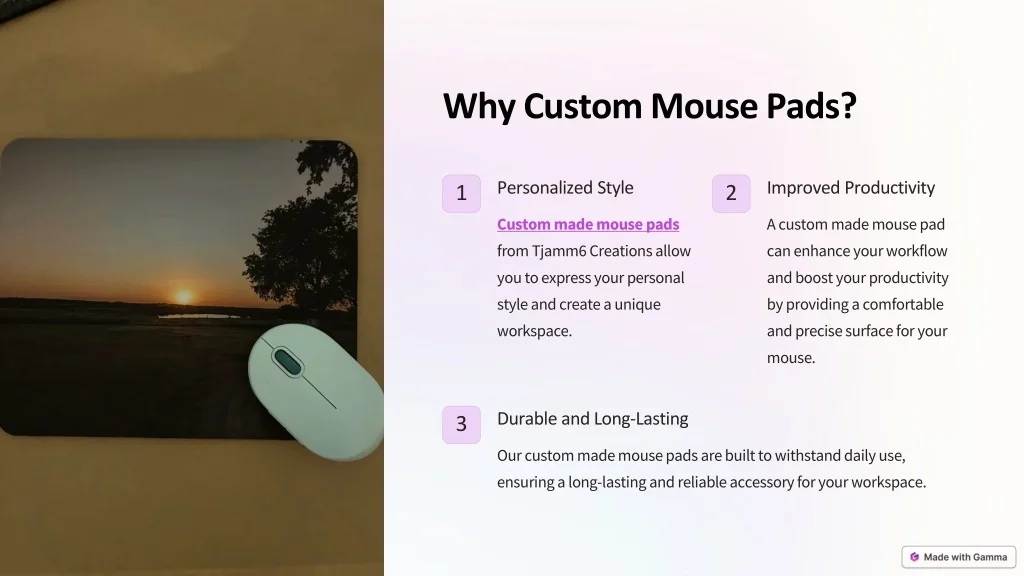 Why Custom Mouse Pads? Personalized Style Improved Productivity 1 2 Custom made mouse pads from Tjamm6 Creations allow you to express your personal style and create a unique workspace. A custom made mouse pad can enhance your workflow and boost your productivity by providing a comfortable and precise surface for your mouse. Durable and Long-Lasting 3 Our custom made mouse pads are built to withstand daily use, ensuring a long-lasting and reliable accessory for your workspace.