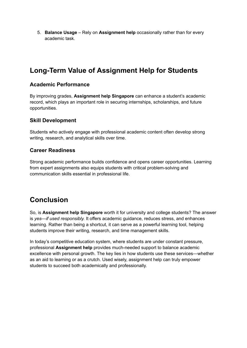 5. Balance Usage – Rely on Assignment help occasionally rather than for every academic task. Long-Term Value of Assignment Help for Students Academic Performance By improving grades, Assignment help Singapore can enhance a student’s academic record, which plays an important role in securing internships, scholarships, and future opportunities. Skill Development Students who actively engage with professional academic content often develop strong writing, research, and analytical skills over time. Career Readiness Strong academic performance builds confidence and opens career opportunities. Learning from expert assignments also equips students with critical problem-solving and communication skills essential in professional life. Conclusion So, is Assignment help Singapore worth it for university and college students? The answer is yes—if used responsibly. It offers academic guidance, reduces stress, and enhances learning. Rather than being a shortcut, it can serve as a powerful learning tool, helping students improve their writing, research, and time management skills. In today’s competitive education system, where students are under constant pressure, professional Assignment help provides much-needed support to balance academic excellence with personal growth. The key lies in how students use these services—whether as an aid to learning or as a crutch. Used wisely, assignment help can truly empower students to succeed both academically and professionally.
