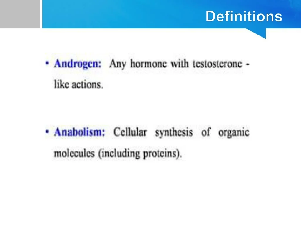 Anabolic Steroids: • These are synthetic androgens with supposedly higher anabolic and lower androgenic activity. • Androgens can be modified chemically to alter the balance of anabolic and other effects. • Drugs as anabolic steroids are Nandrolone, Oxyrnetholone, Stanozolol and Methandienone.