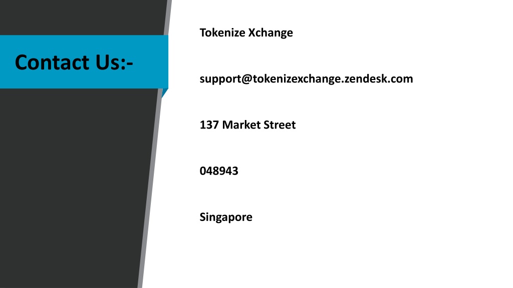 Tokenize Xchange support@tokenizexchange.zendesk.com 137 Market Street 048943 Singapore Contact Us:- Add your title