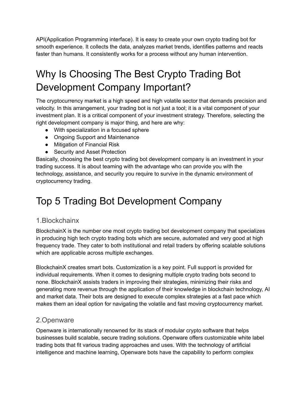 API(Application Programming interface). It is easy to create your own crypto trading bot for smooth experience. It collects the data, analyzes market trends, identifies patterns and reacts faster than humans. It consistently works for a process without any human intervention. Why Is Choosing The Best Crypto Trading Bot Development Company Important? The cryptocurrency market is a high speed and high volatile sector that demands precision and velocity. In this arrangement, your trading bot is not just a tool; it is a vital component of your investment plan. It is a critical component of your investment strategy. Therefore, selecting the right development company is major thing, and here are why: ● With specialization in a focused sphere ● Ongoing Support and Maintenance ● Mitigation of Financial Risk ● Security and Asset Protection Basically, choosing the best crypto trading bot development company is an investment in your trading success. It is about teaming with the advantage who can provide you with the technology, assistance, and security you require to survive in the dynamic environment of cryptocurrency trading. Top 5 Trading Bot Development Company 1.Blockchainx BlockchainX is the number one most crypto trading bot development company that specializes in producing high tech crypto trading bots which are secure, automated and very good at high frequency trade. They cater to both institutional and retail traders by offering scalable solutions which are applicable across multiple exchanges. BlockchainX creates smart bots. Customization is a key point. Full support is provided for individual requirements. When it comes to designing multiple crypto trading bots second to none. BlockchainX assists traders in improving their strategies, minimizing their risks and generating more revenue through the application of their knowledge in blockchain technology, AI and market data. Their bots are designed to execute complex strategies at a fast pace which makes them an ideal option for navigating the volatile and fast moving cryptocurrency market. 2.Openware Openware is internationally renowned for its stack of modular crypto software that helps businesses build scalable, secure trading solutions. Openware offers customizable white label trading bots that fit various trading approaches and uses. With the technology of artificial intelligence and machine learning, Openware bots have the capability to perform complex