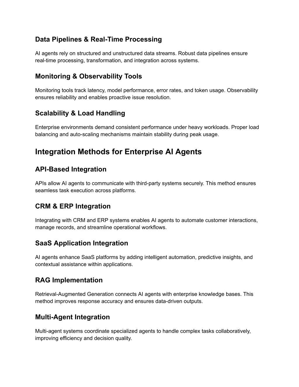 Data Pipelines & Real-Time Processing AI agents rely on structured and unstructured data streams. Robust data pipelines ensure real-time processing, transformation, and integration across systems. Monitoring & Observability Tools Monitoring tools track latency, model performance, error rates, and token usage. Observability ensures reliability and enables proactive issue resolution. Scalability & Load Handling Enterprise environments demand consistent performance under heavy workloads. Proper load balancing and auto-scaling mechanisms maintain stability during peak usage. Integration Methods for Enterprise AI Agents API-Based Integration APIs allow AI agents to communicate with third-party systems securely. This method ensures seamless task execution across platforms. CRM & ERP Integration Integrating with CRM and ERP systems enables AI agents to automate customer interactions, manage records, and streamline operational workflows. SaaS Application Integration AI agents enhance SaaS platforms by adding intelligent automation, predictive insights, and contextual assistance within applications. RAG Implementation Retrieval-Augmented Generation connects AI agents with enterprise knowledge bases. This method improves response accuracy and ensures data-driven outputs. Multi-Agent Integration Multi-agent systems coordinate specialized agents to handle complex tasks collaboratively, improving efficiency and decision quality.