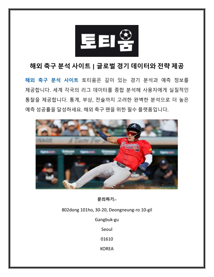 해외축구분석사이트 | 글로벌경기데이터와전략제공 해외축구분석사이트토티움은깊이있는경기분석과예측정보를 제공합니다. 세계각국의리그데이터를종합분석해사용자에게실질적인 통찰을제공합니다. 통계, 부상, 전술까지고려한완벽한분석으로더높은 예측성공률을달성하세요. 해외축구팬을위한필수플랫폼입니다. 문의하기:‐ 802dong 101ho, 30-20, Deongneung-ro 10-gil Gangbuk-gu Seoul 01610 KOREA