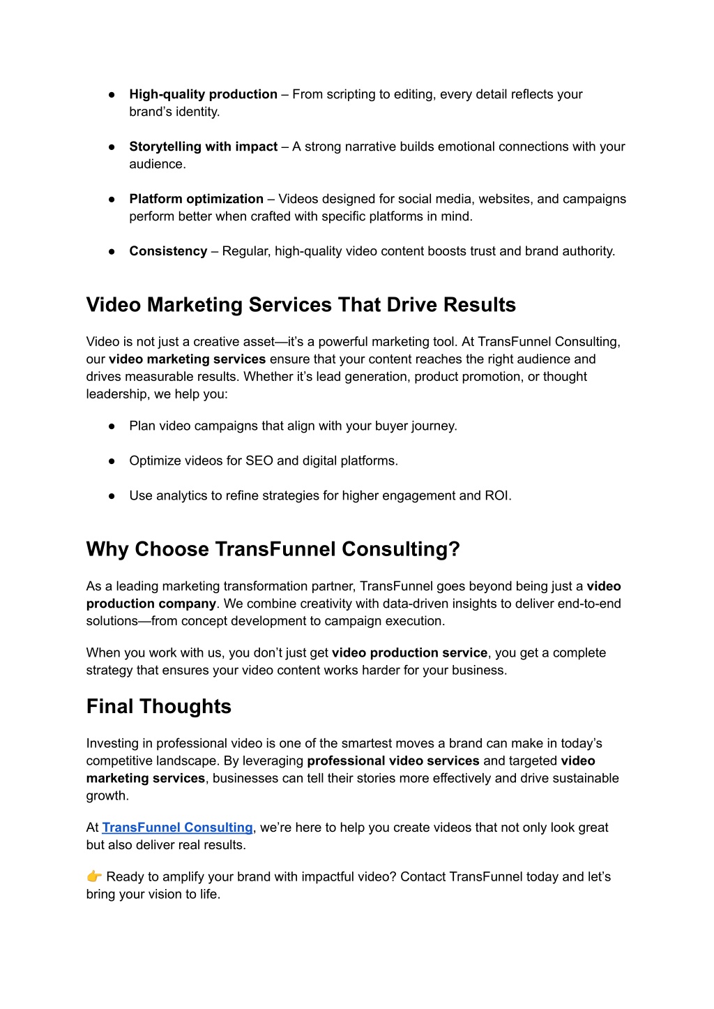 ● High-quality production – From scripting to editing, every detail reflects your brand’s identity. ● Storytelling with impact – A strong narrative builds emotional connections with your audience. ● Platform optimization – Videos designed for social media, websites, and campaigns perform better when crafted with specific platforms in mind. ● Consistency – Regular, high-quality video content boosts trust and brand authority. Video Marketing Services That Drive Results Video is not just a creative asset—it’s a powerful marketing tool. At TransFunnel Consulting, our video marketing services ensure that your content reaches the right audience and drives measurable results. Whether it’s lead generation, product promotion, or thought leadership, we help you: ● Plan video campaigns that align with your buyer journey. ● Optimize videos for SEO and digital platforms. ● Use analytics to refine strategies for higher engagement and ROI. Why Choose TransFunnel Consulting? As a leading marketing transformation partner, TransFunnel goes beyond being just a video production company. We combine creativity with data-driven insights to deliver end-to-end solutions—from concept development to campaign execution. When you work with us, you don’t just get video production service, you get a complete strategy that ensures your video content works harder for your business. Final Thoughts Investing in professional video is one of the smartest moves a brand can make in today’s competitive landscape. By leveraging professional video services and targeted video marketing services, businesses can tell their stories more effectively and drive sustainable growth. At TransFunnel Consulting, we’re here to help you create videos that not only look great but also deliver real results. ? Ready to amplify your brand with impactful video? Contact TransFunnel today and let’s bring your vision to life.