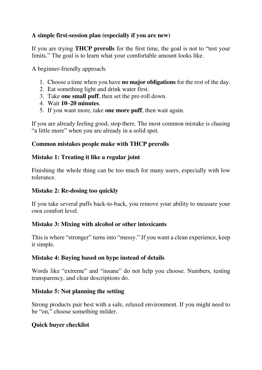 A simple first-session plan (especially if you are new) If you are trying THCP prerollsfor the first time, the goal is not to “test your limits.” The goal is to learn what your comfortable amount looks like. A beginner-friendly approach: 1.Choose a time when you have no major obligations for the rest of the day. 2.Eat something light and drink water first. 3.Take one small puff, then set the pre-roll down. 4.Wait 10–20 minutes. 5.If you want more, take one more puff, then wait again. If you are already feeling good, stop there. The most common mistake is chasing “a little more” when you are already in a solid spot. Common mistakes people make with THCP prerolls Mistake 1: Treating it like a regular joint Finishing the whole thing can be too much for many users, especially with low tolerance. Mistake 2: Re-dosing too quickly If you take several puffs back-to-back, you remove your ability to measure your own comfort level. Mistake 3: Mixing with alcohol or other intoxicants This is where “stronger” turns into “messy.” If you want a clean experience, keep it simple. Mistake 4: Buying based on hype instead of details Words like “extreme” and “insane” do not help you choose. Numbers, testing transparency, and clear descriptions do. Mistake 5: Not planning the setting Strong products pair best with a safe, relaxed environment. If you might need to be “on,” choose something milder. Quick buyer checklist