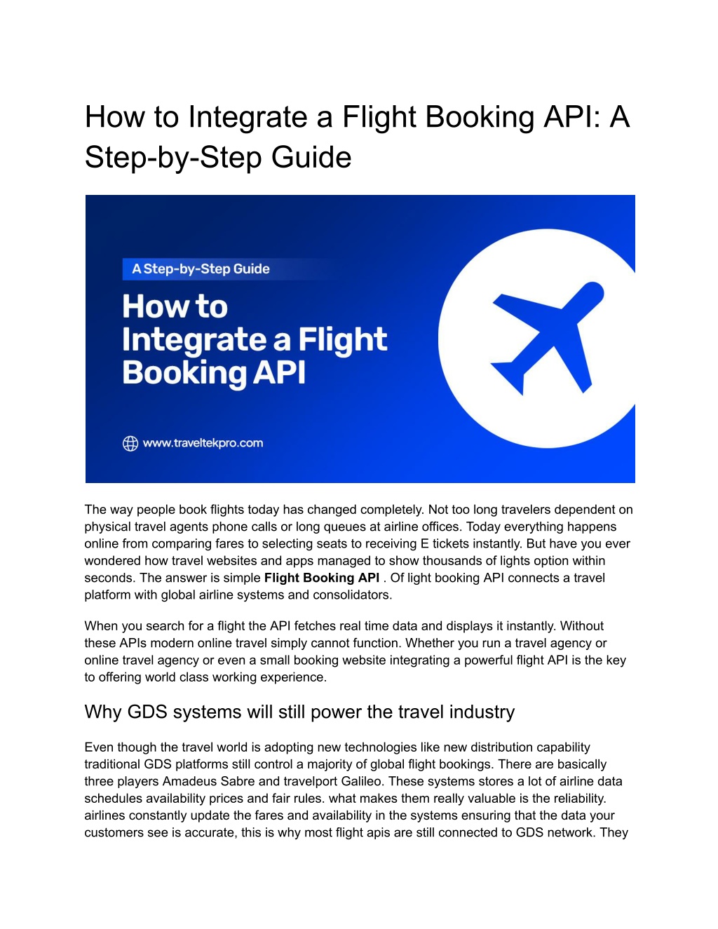 1. How to Integrate a Flight Booking API: A Step-by-Step Guide The way people book flights today has changed completely. Not too long travelers dependent on physical travel agents phone calls or long queues at airline offices. Today everything happens online from comparing fares to selecting seats to receiving E tickets instantly. But have you ever wondered how travel websites and apps managed to show thousands of lights option within seconds. The answer is simple Flight Booking API . Of light booking API connects a travel platform with global airline systems and consolidators. When you search for a flight the API fetches real time data and displays it instantly. Without these APIs modern online travel simply cannot function. Whether you run a travel agency or online travel agency or even a small booking website integrating a powerful flight API is the key to offering world class working experience. Why GDS systems will still power the travel industry Even though the travel world is adopting new technologies like new distribution capability traditional GDS platforms still control a majority of global flight bookings. There are basically three players Amadeus Sabre and travelport Galileo. These systems stores a lot of airline data schedules availability prices and fair rules. what makes them really valuable is the reliability. airlines constantly update the fares and availability in the systems ensuring that the data your customers see is accurate, this is why most flight apis are still connected to GDS network. They
